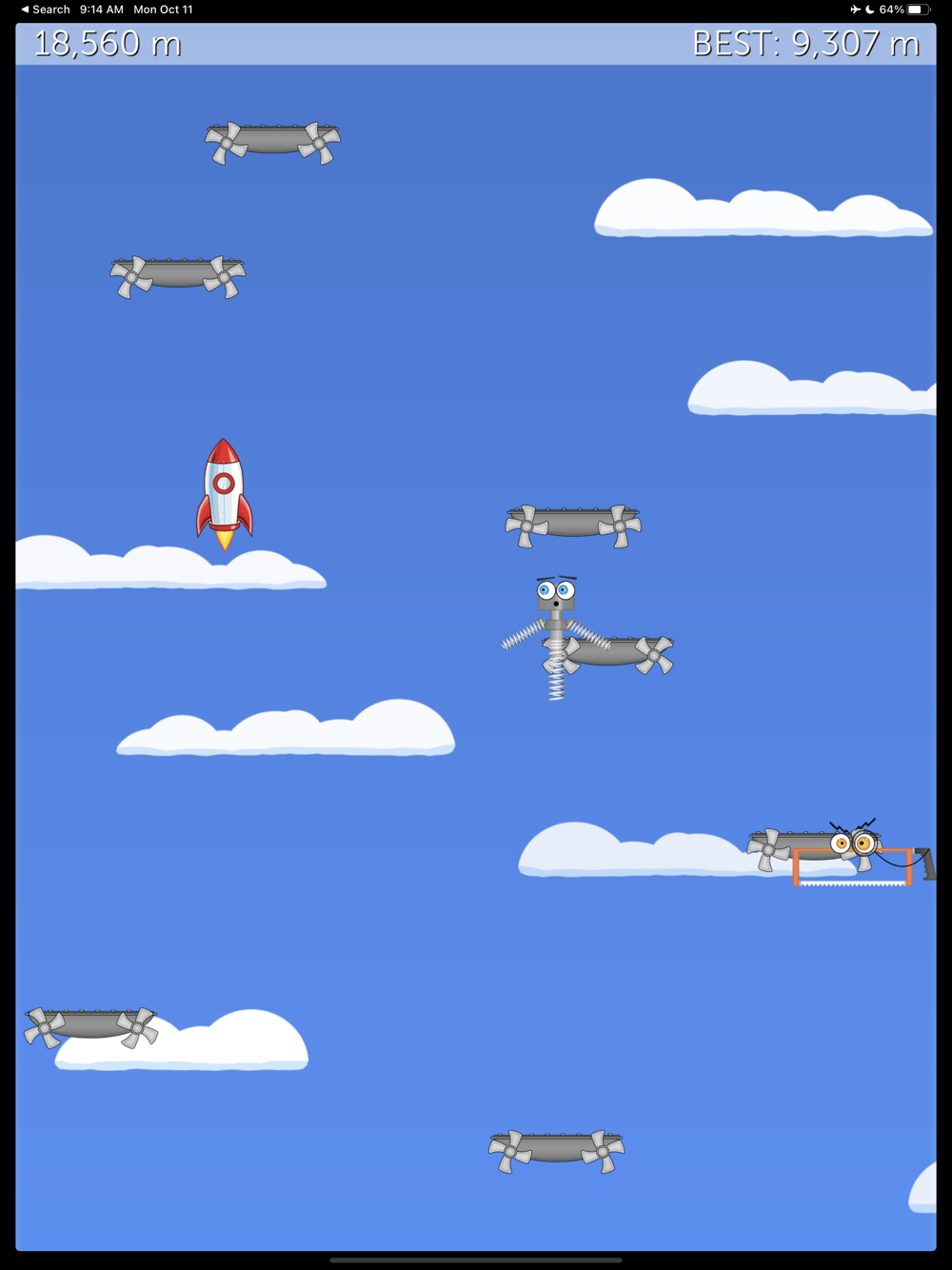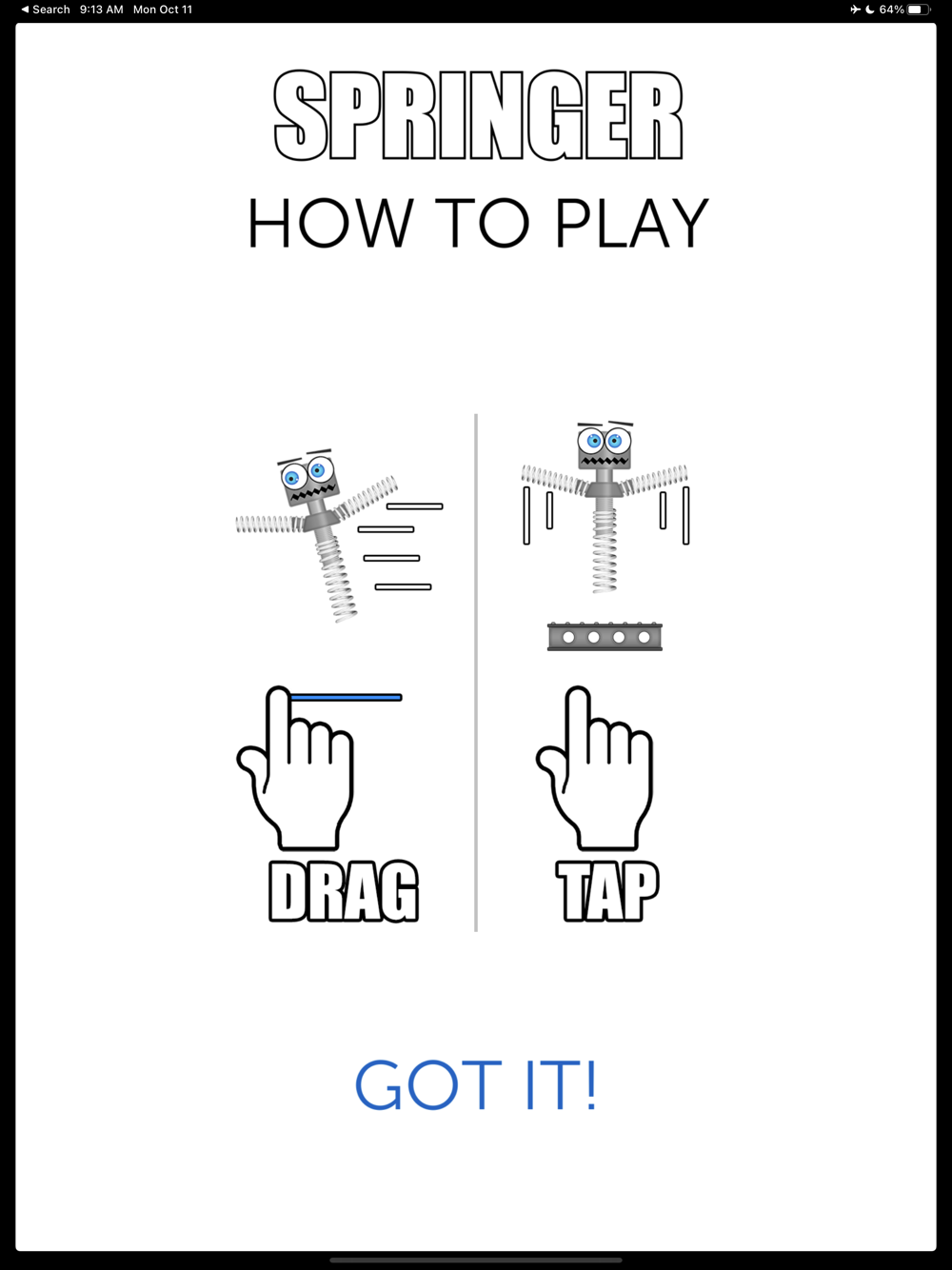 Drag your finger across the screen to move Springer to a safe platform. Tap upon landing on a platform for a super bounce! Grab onto rockets to blast off and launch through the stratosphere and beyond.