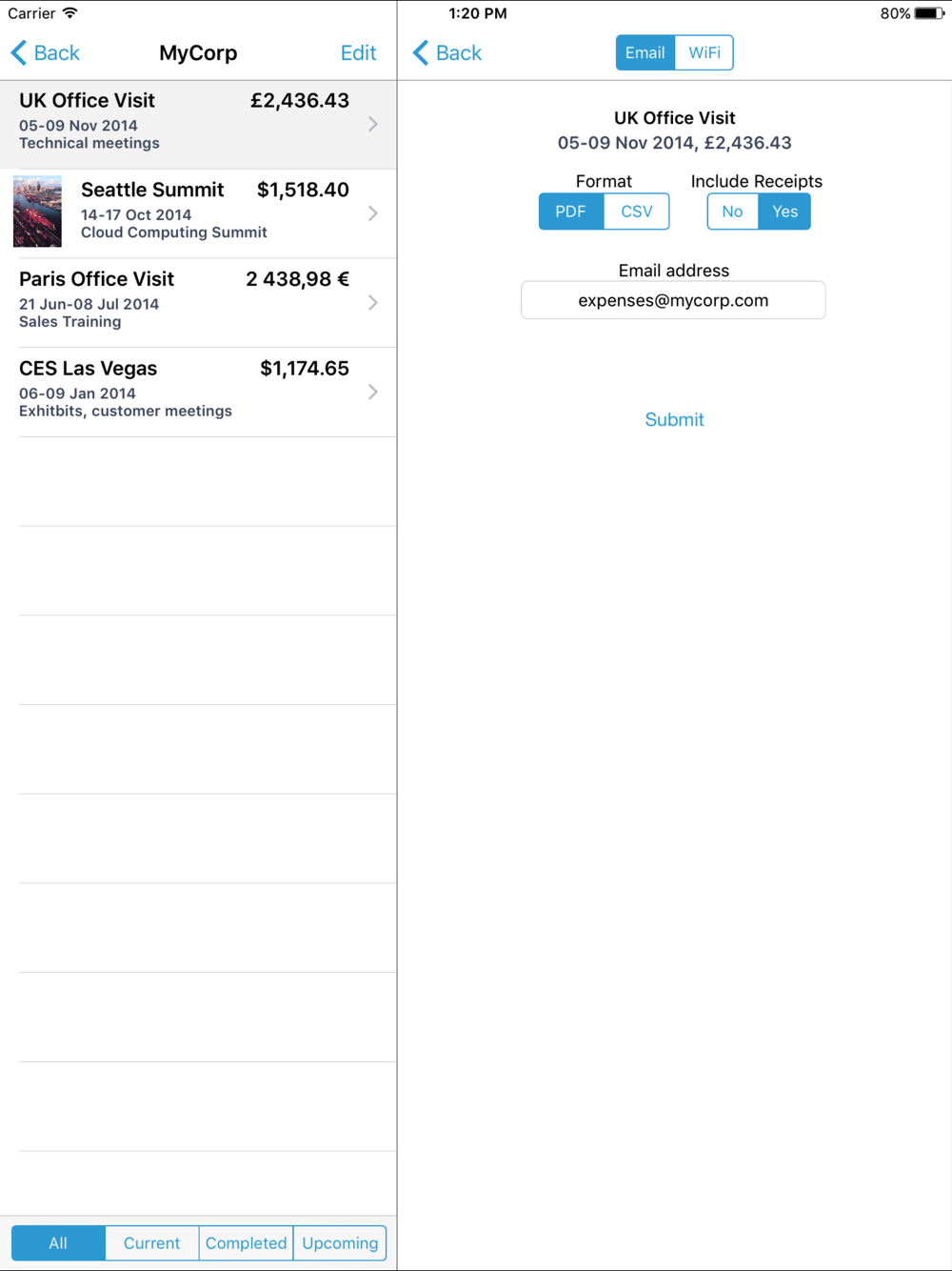 - Submit expense reports by email, or export a HTML/CSV file via Wifi with all receipts (in a zip file)