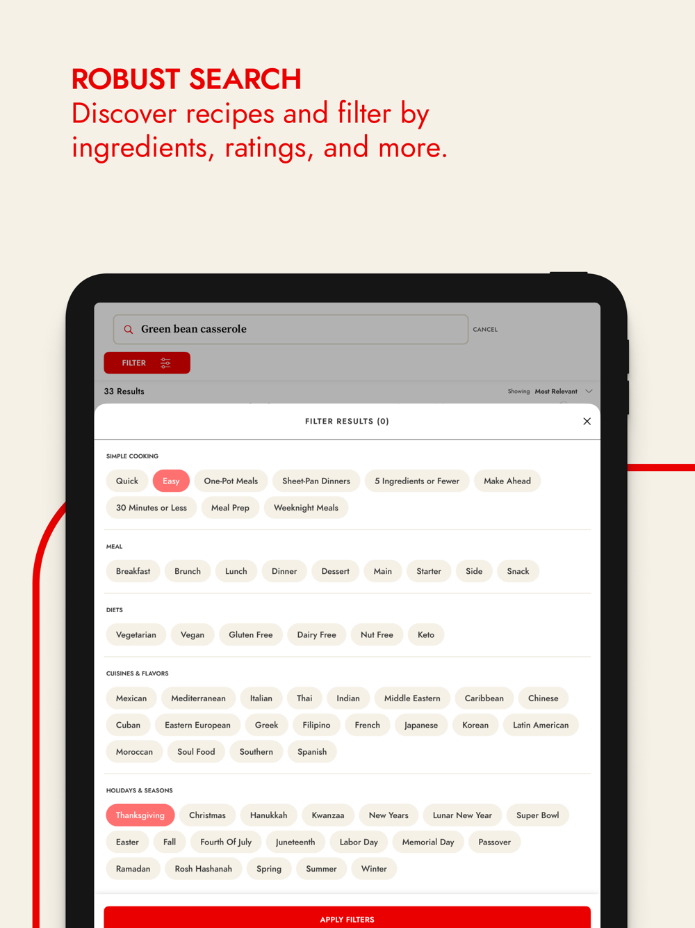 What Do You Want to Cook? Advanced search functions make it easy to find exactly what you’re looking for. Search our entire catalog by meal, diet, occasion, ingredients and more. Save your favorites so they are always close at hand.