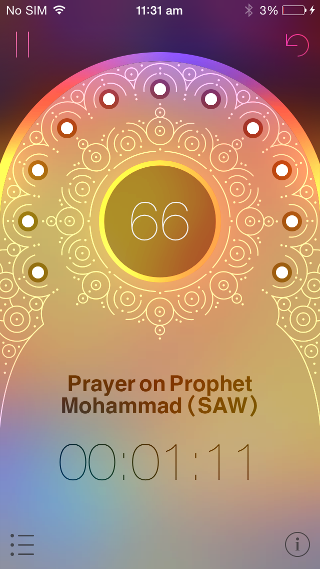 3. A detailed Subha view where tapping on the screen counts as a single Tasbeeh. A counter along with a session timer is displayed.