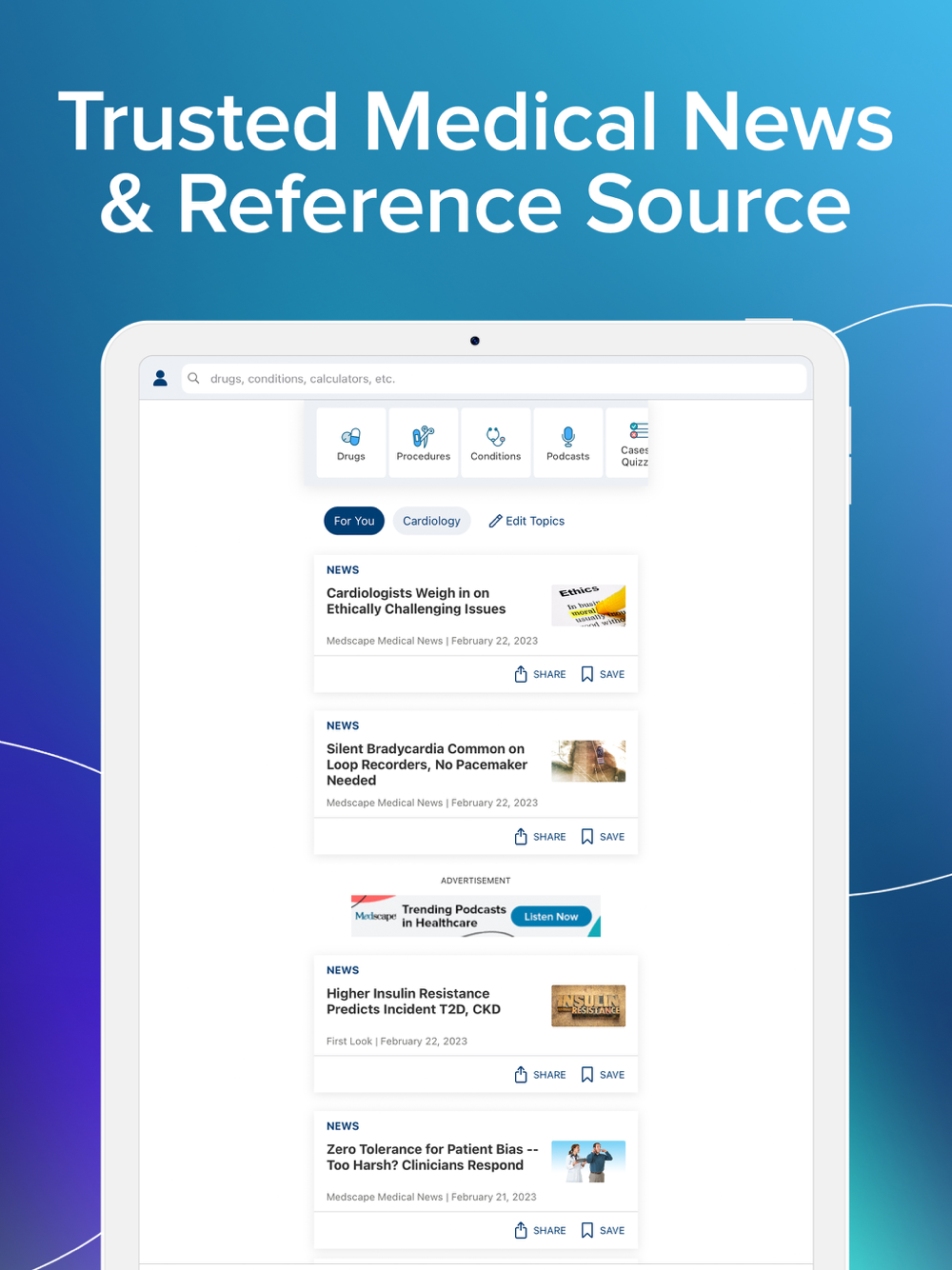 Your go-to medical resource to get immediate clinical answers. With Medscape, you get free access to the latest news, expert commentary, clinical tools, drugs and disease information, medical podcasts, CME/CE activities, and more.
