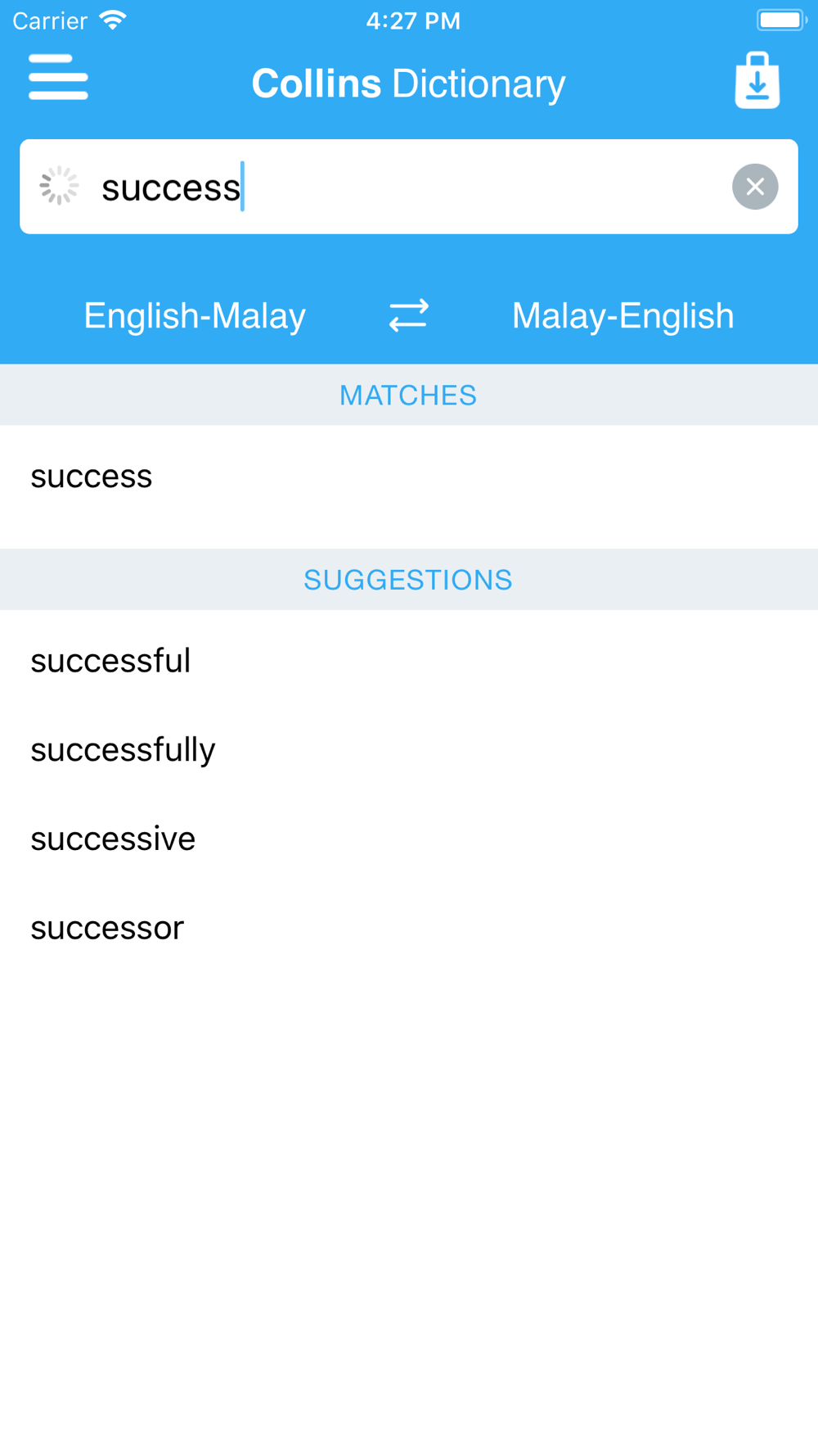 • Search autocomplete helps you find words quickly by displaying predictions as you type.