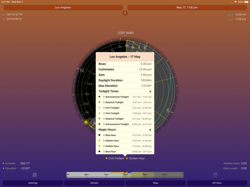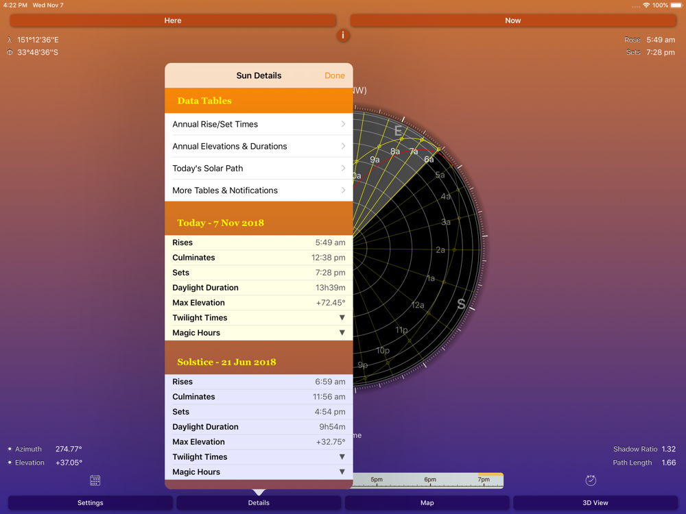 * Get additional details including sun rise, sunset & culmination times, maximum elevation, civil, nautical & astronomical twilight times of the sun.
