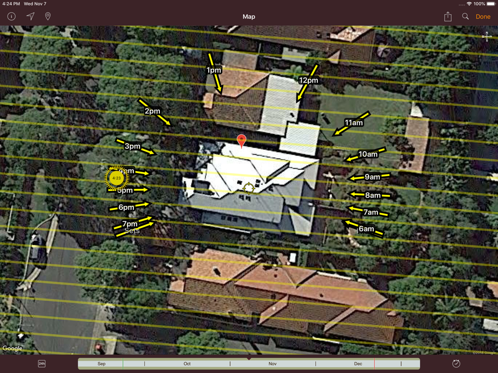 * Map view shows solar direction arrows, sun path & elevations for each hour of the day.