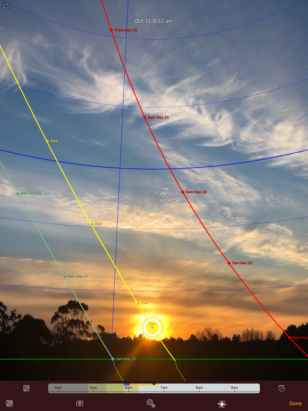 * This sun rise calendar app allows the user to include equinox, summer & winter solstice paths on both flat compass view & camera view.