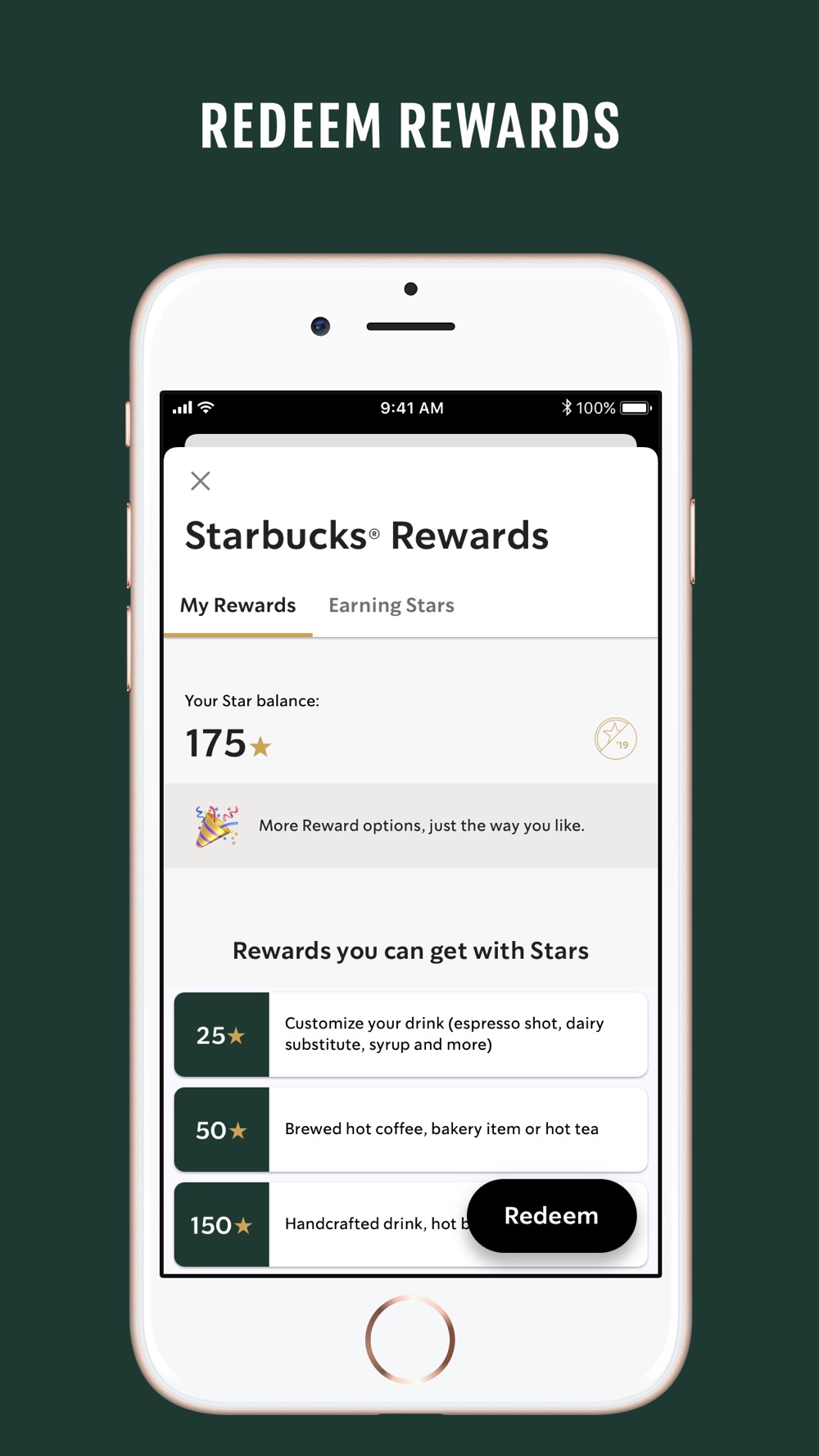 Join Starbucks® Rewards and unlock exclusive benefits while earning Stars with almost every purchase. Redeem Stars for free drinks, food and more. Starbucks® Rewards members can look forward to a birthday treat plus complimentary coffee and tea refills.*