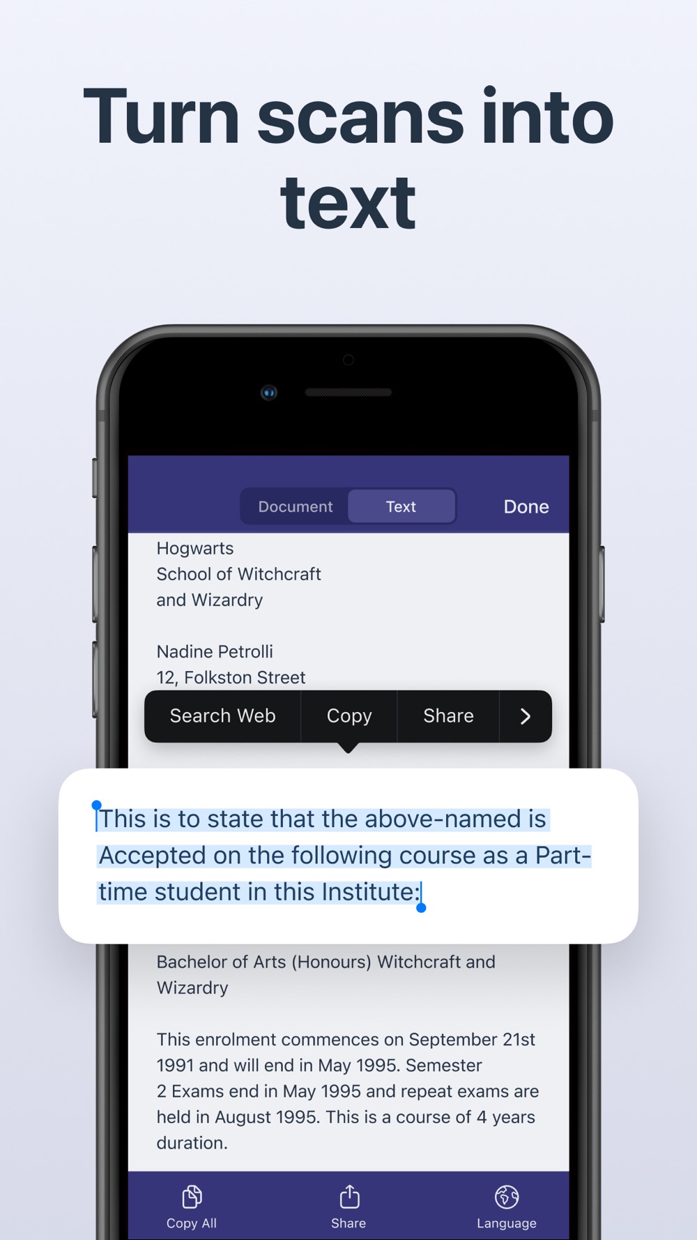 - Turn your scans into text, so you can read, copy, and export it to other apps