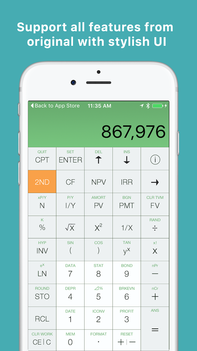 Full-feature emulates Texas Instruments BA II Plus Professional Financial Calculator for iPhone, iPad, and Apple Watch. Built with identical algorithms and formulas of original, it provides exact same capabilities and operation sequences, and beyond with better user experience.