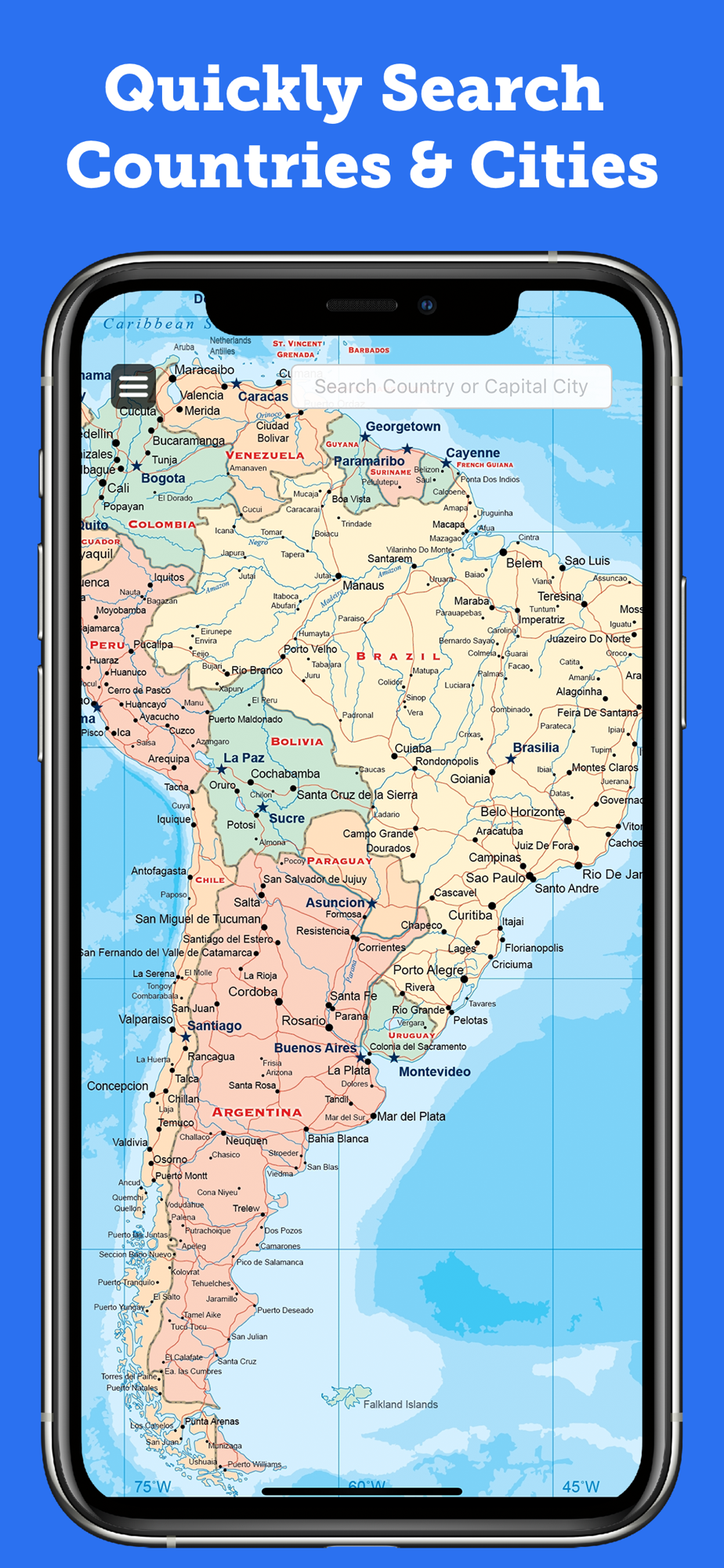 * Search for Countries and Capital Cities quickly and easily.