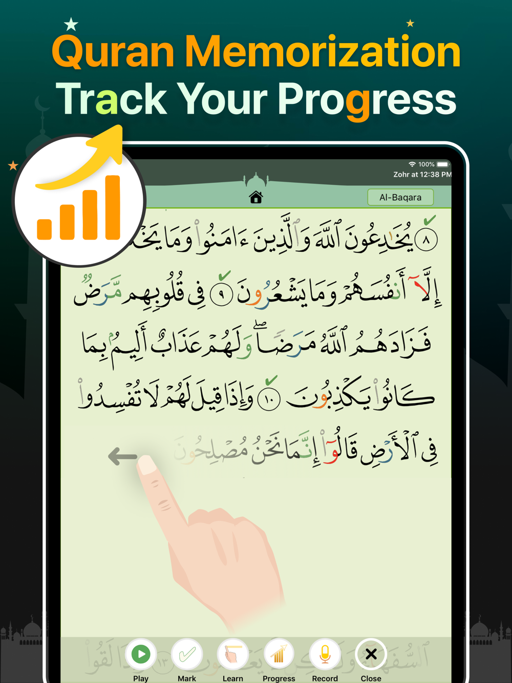 ● Advanced audio options to help with memorization (repetition of ayah, Surah, number of repetitions, interval, and recitation speed).