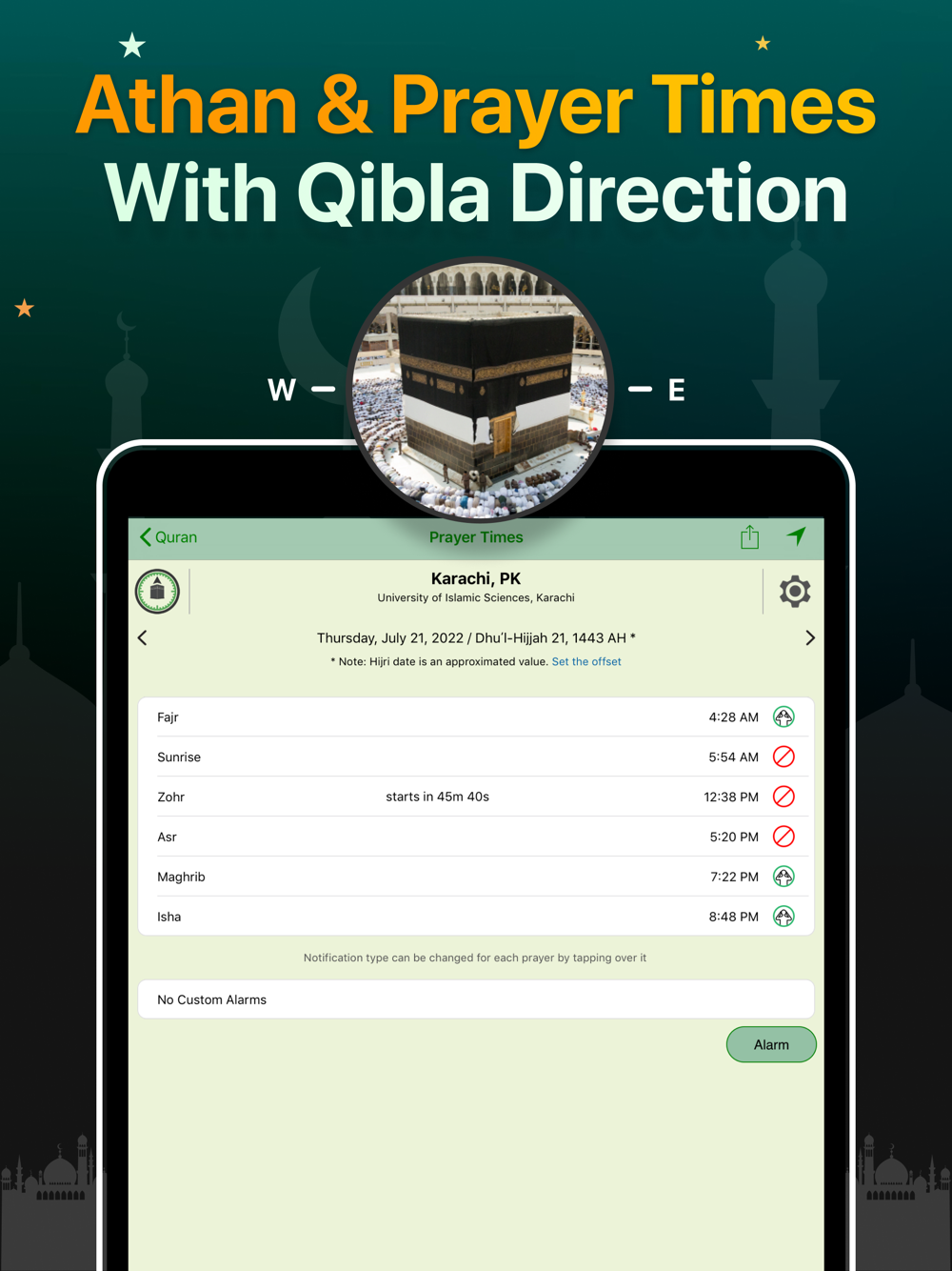 أوقات الصلاة لجميع أنحاء العالم مع خيار تنبيه الأذان، ودعم طرق مختلفة لحساب أوقات الصلاة، وبوصلة القبلة، وأوقات السحور والإفطار