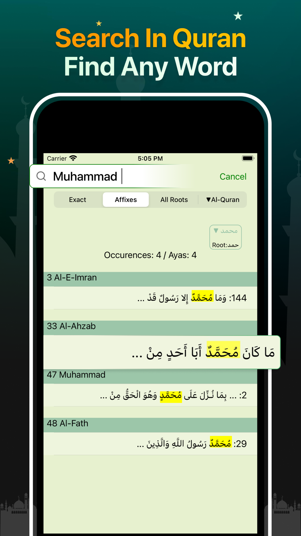 ● Highly advanced “Search” feature that can help with searching any word (search exact word, affixes or all roots) in the Arabic text, any of the translations and English Tafsir.