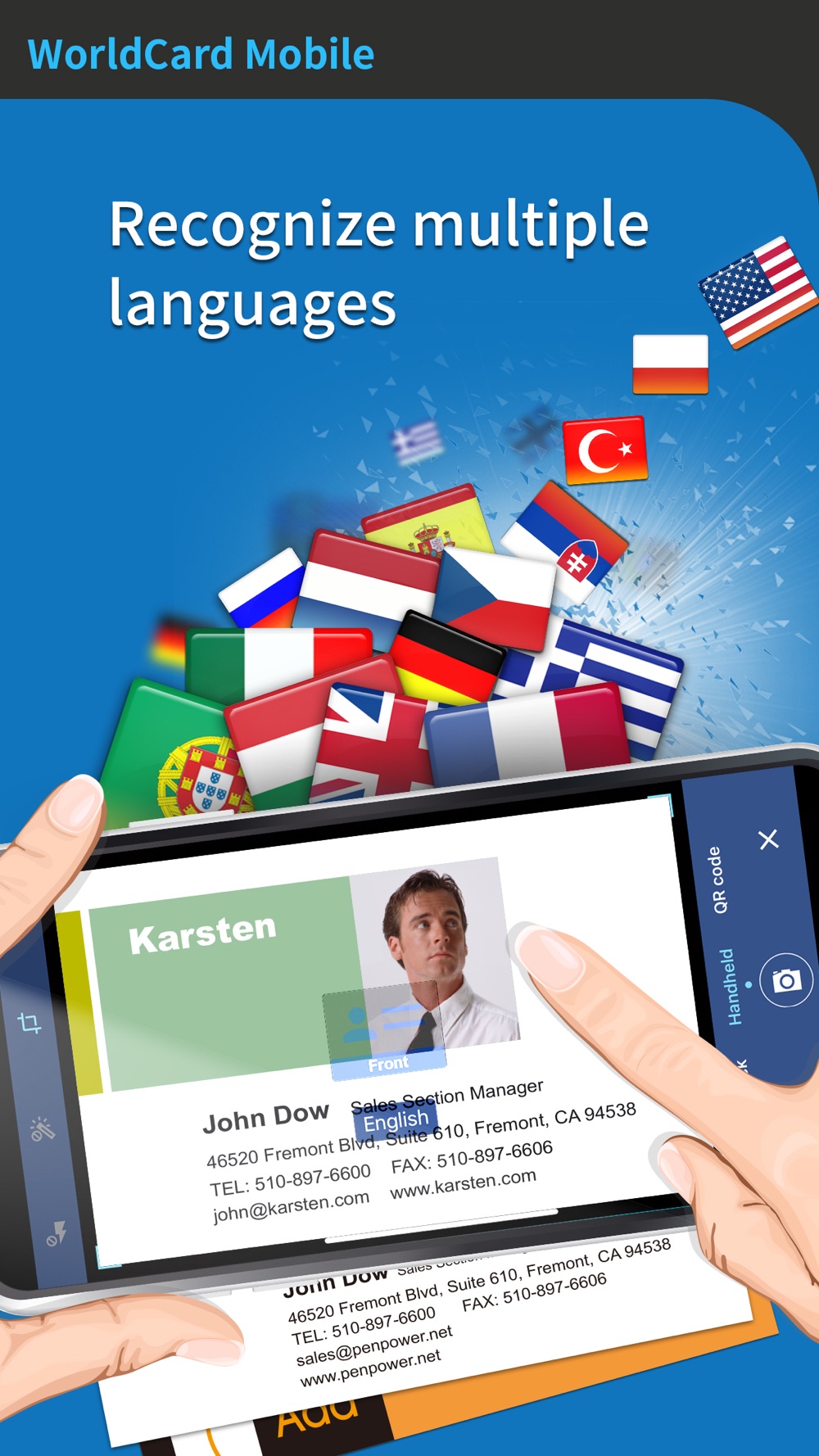 - Recognize business cards in 25 different languages: English, French, German, Italian, Dutch, Turkish, Polish, Hungarian, Russian, Swedish, Norwegian, Japanese, Korean, Finnish, Danish, Greek, Czech, Slovak, Traditional Chinese, Simplified Chinese, Spanish(Mexico & Spain), Portuguese(Portugal & Brazil), Arabic language