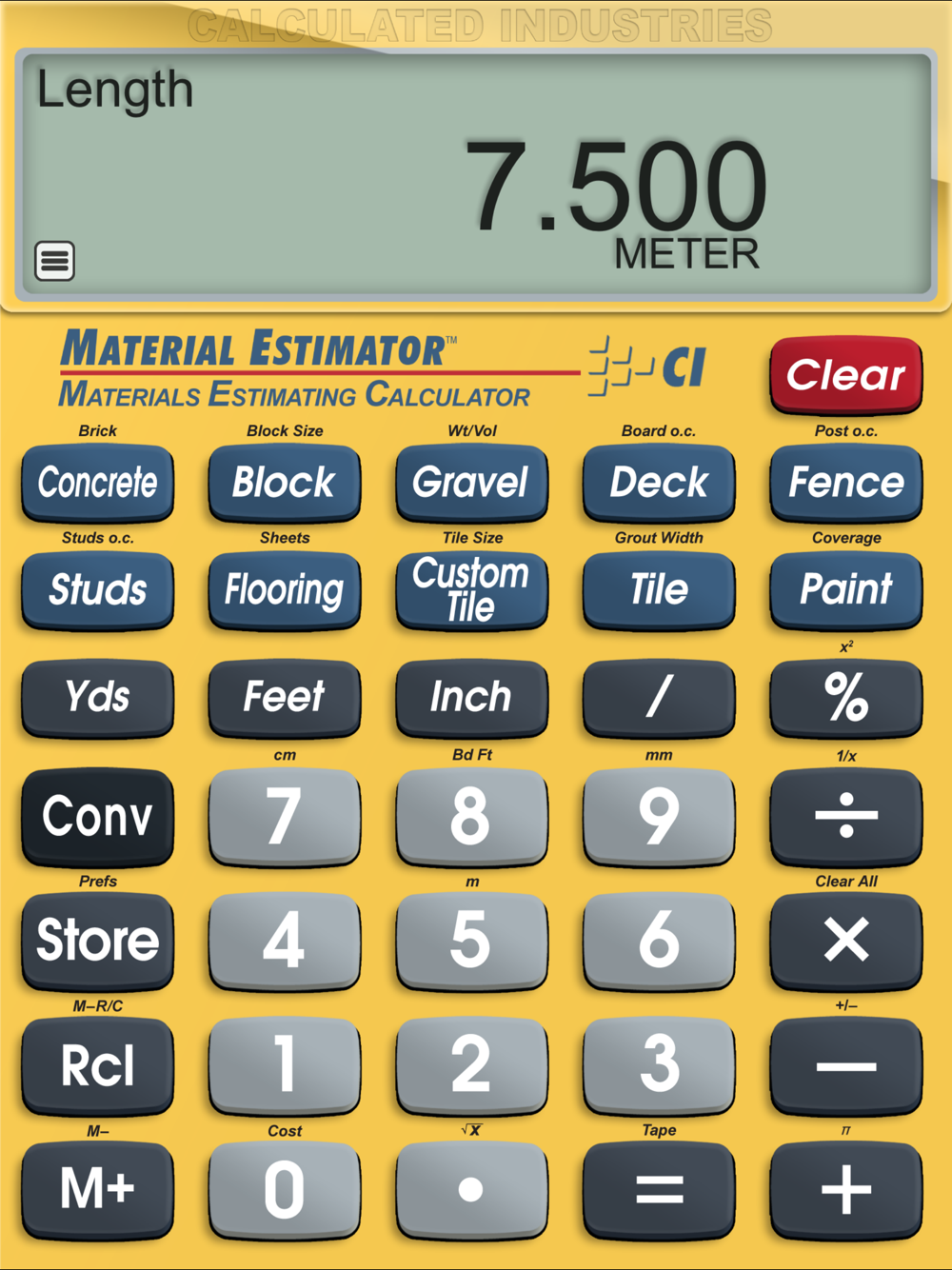 The Material Estimator Building Materials Estimating app from Calculated Industries will help you save time and money on any building project. Quickly and easily calculate material quantities, costs and allowances. Work in and convert between feet, inches, fractions, yards and metric -- and includes a full User’s Guide built in as well as the ability to press and hold a key for specific help!