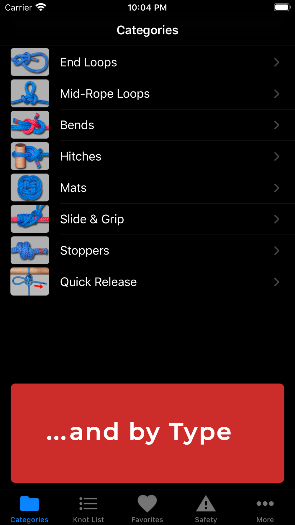TYPE - Basic knots (8), Bends (14), End loops (22), Hitches (35), Mats (4), Mid loops (11), Quick Release (10), Slide & Grip (13), Splices (15) & Stopper knots (10).