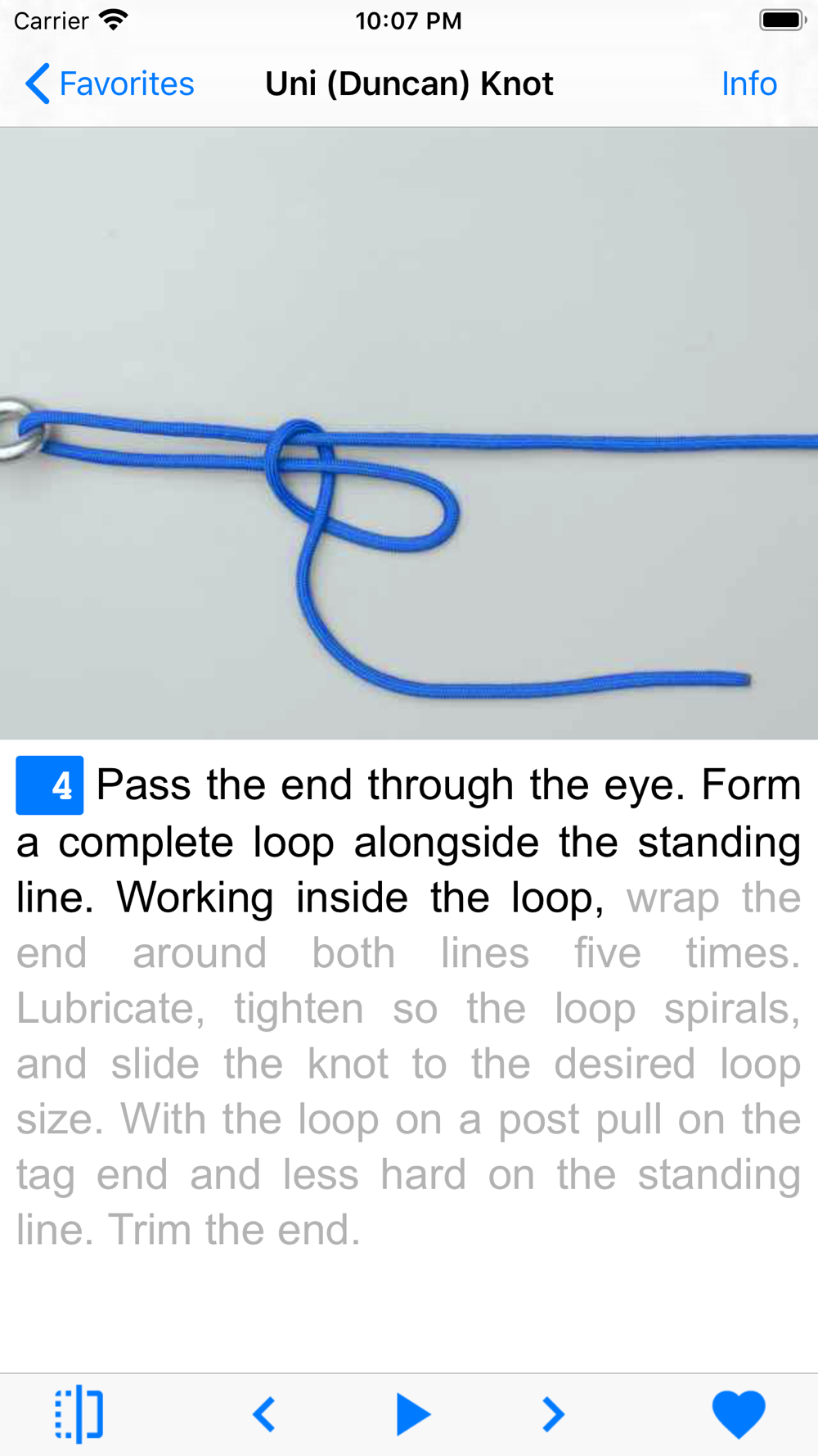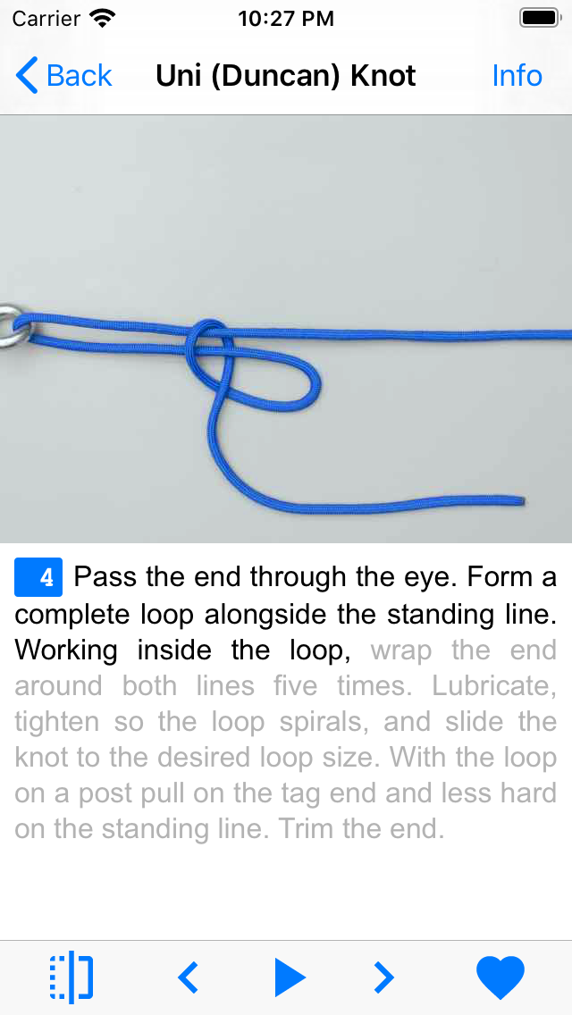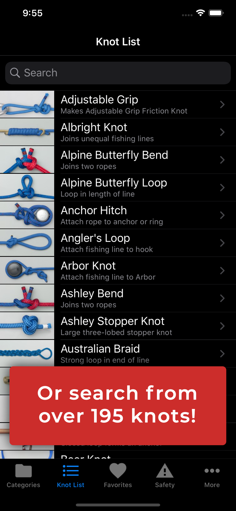 Watch knots tie themselves in simple step-by-step image animations, or click frame-by-frame (at your own speed) as you learn to tie each knot - using the NORMAL or MIRROR orientation (great for left-handers). When viewing a knot, simply tap INFO (top right) to get detailed descriptions about each knot's correct use, advantages & disadvantages, safety considerations, similar knots, alternatives, and other information.