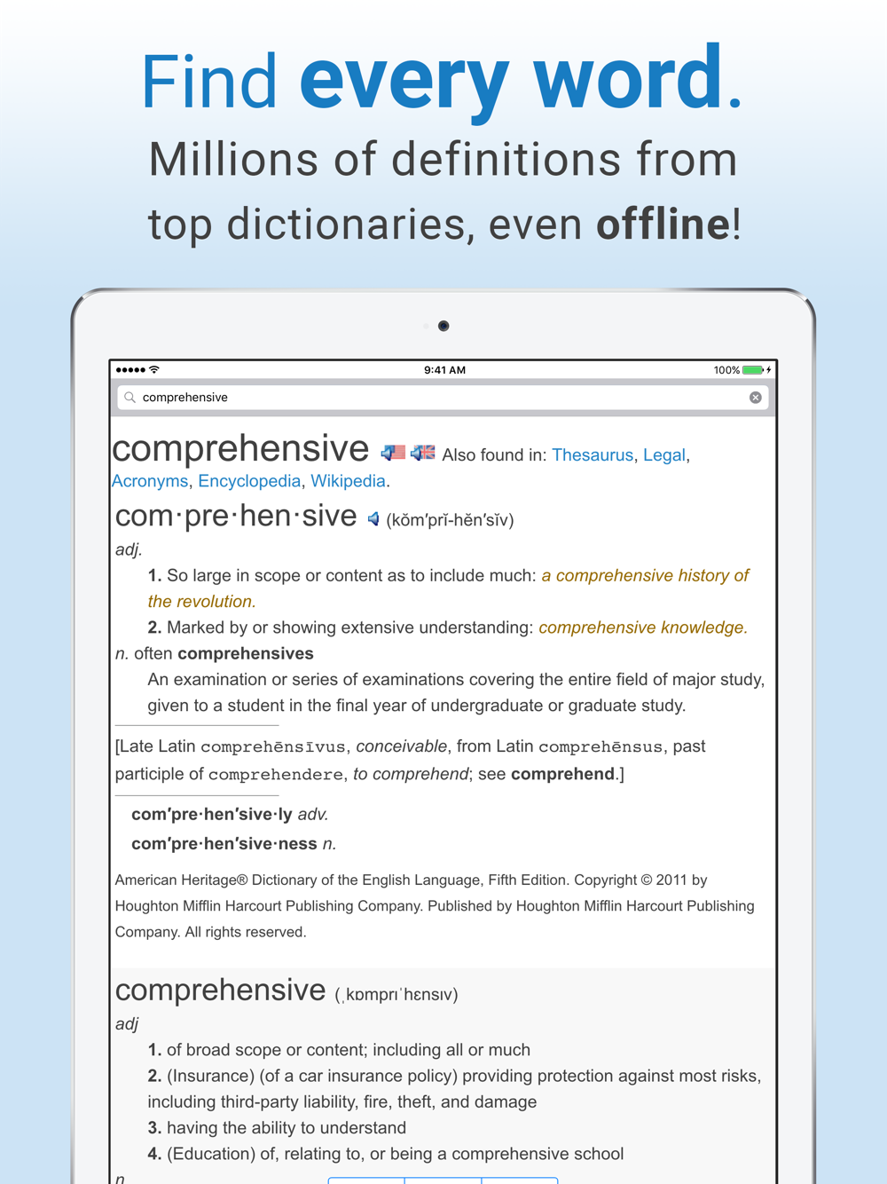 The only Dictionary and Thesaurus with every word you search for. Plus Word of the Day, free offline dictionary access, and millions of definitions and synonyms from top sources, including: