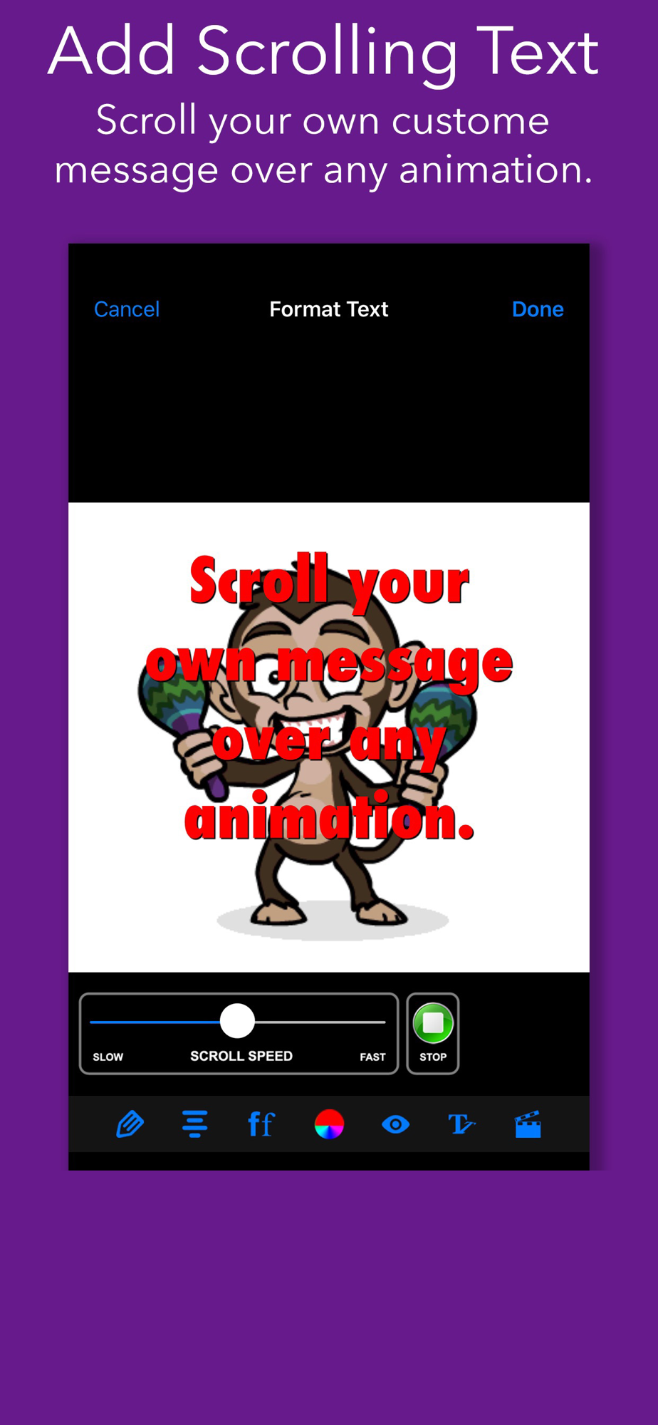 • PERSONALIZE items by adding text to any animation. Adjust font, color, size, and placement. You can even add your text to the end of the animation.