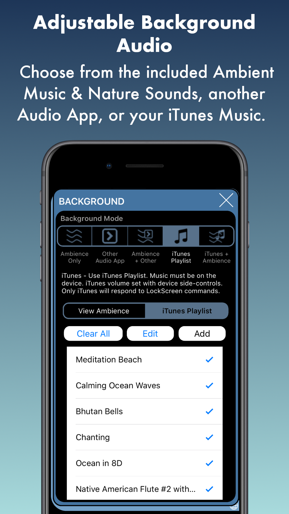 * To combine Brainwaves and Ambience with Audio from Another App use the 'Ambience + Other App' background mode.
