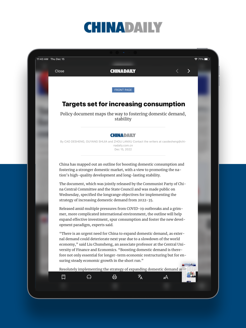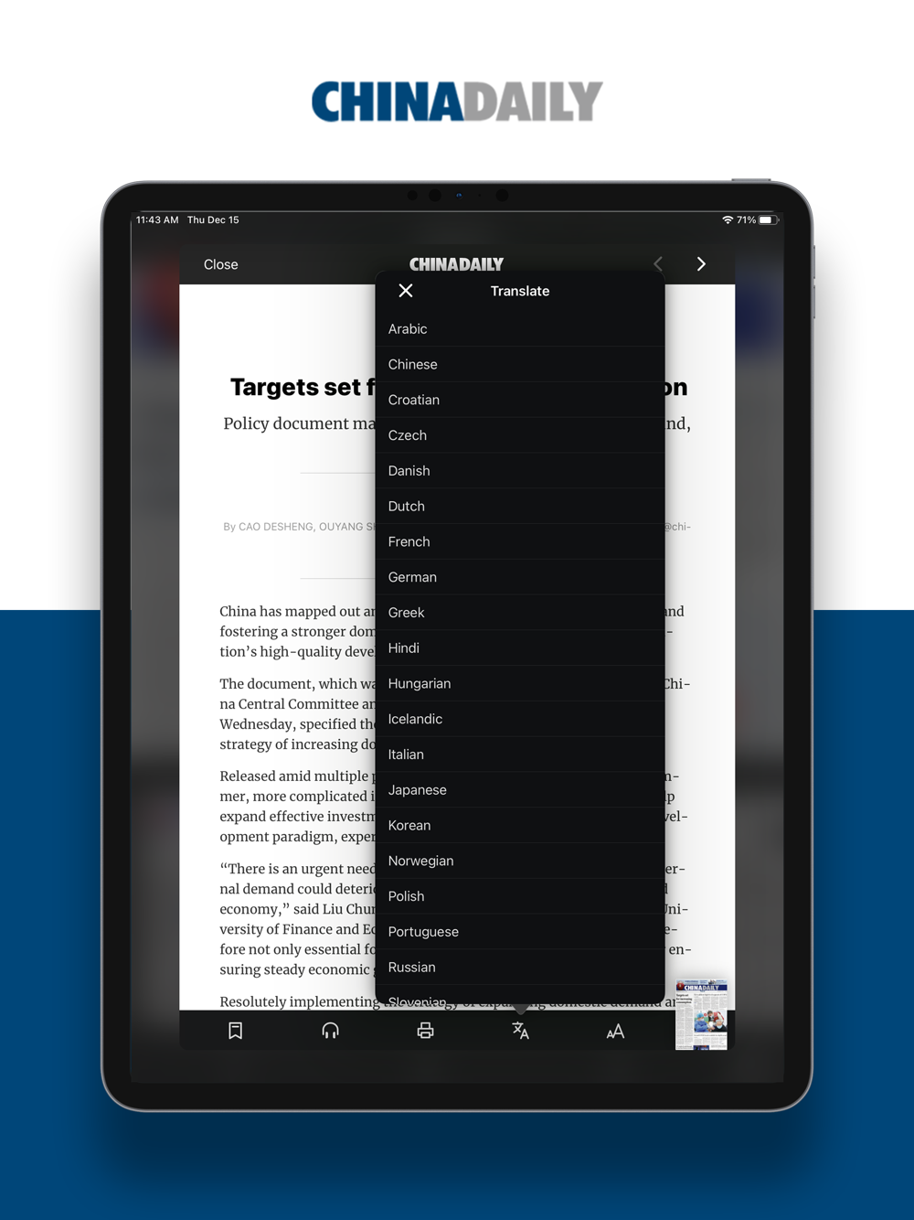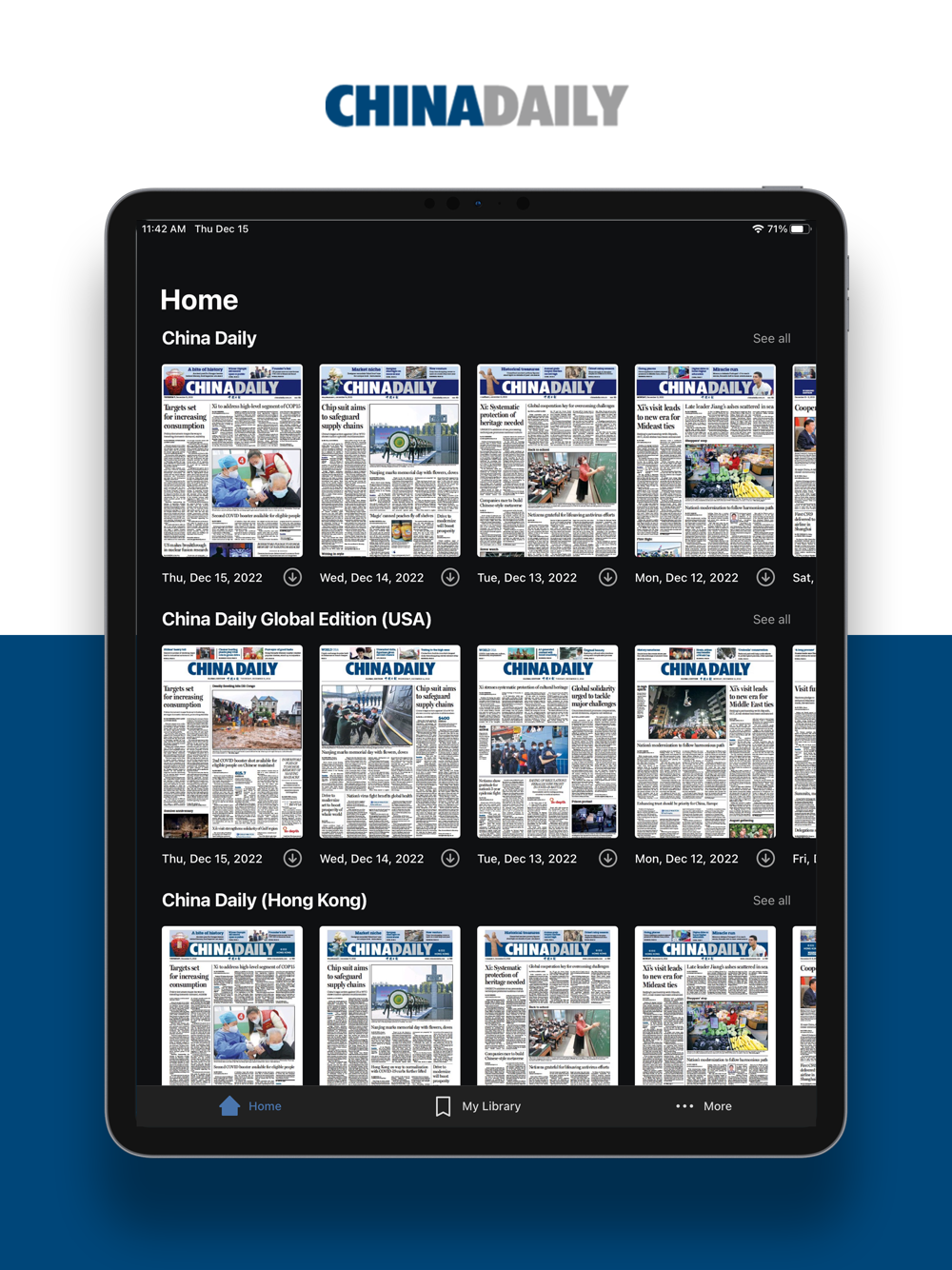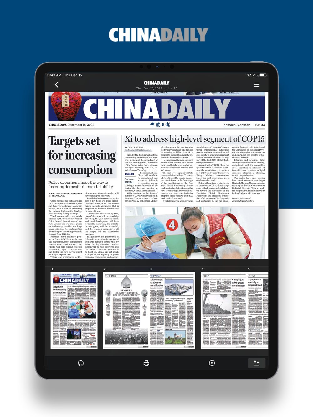 You can now have CHINA DAILY at your fingertips. The China Daily iPaper app from NewspaperDirect gives you every section of CHINA DAILY every day -- full-content digital replicas in their original layout. The app is free, and you can link your existing China Daily Smart Edition account to download the paper wherever you are. Flip pages, pan and zoom in to view any page, article or photo in stunning clarity.