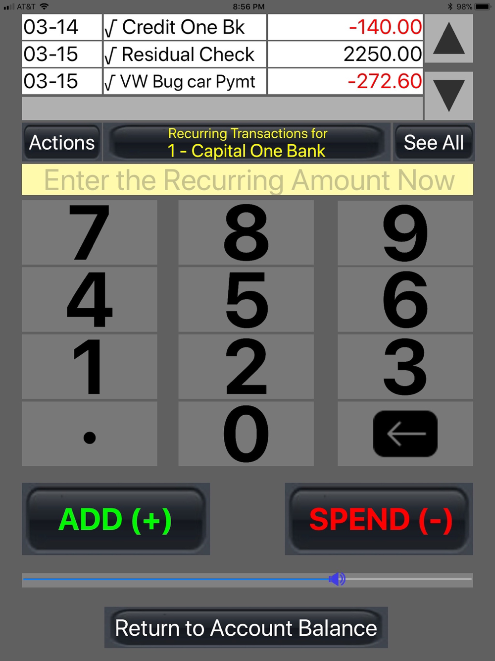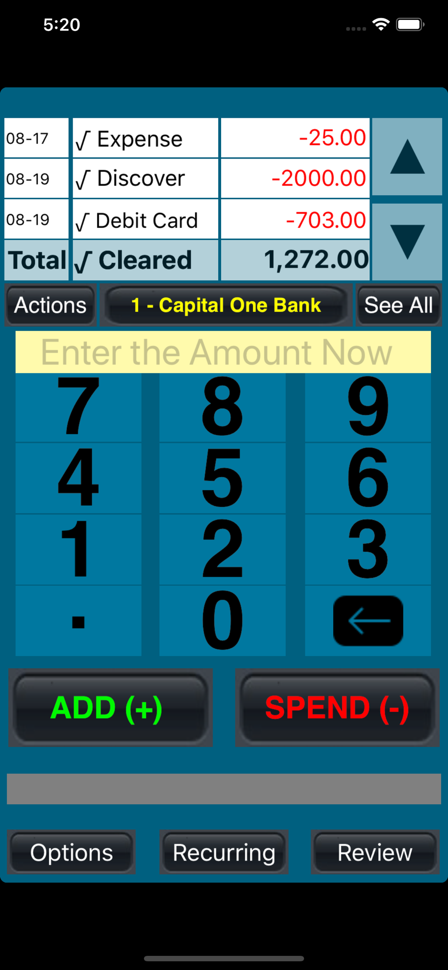 This app has a large custom numeric keypad and you only need to enter the amount and tap “Add” or “Spend” for debit accounts or "spend" or "payment" for credit accounts. If you want to add a transaction description, just type it or select one from the description selection list.