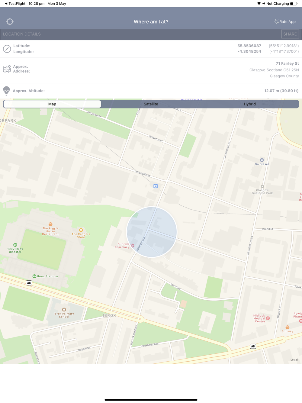 Simply open the app to have your iPhone or iPad device instantly zoom in on your position. Coordinates, address, and even altitude will be displayed so you know your exact location.
