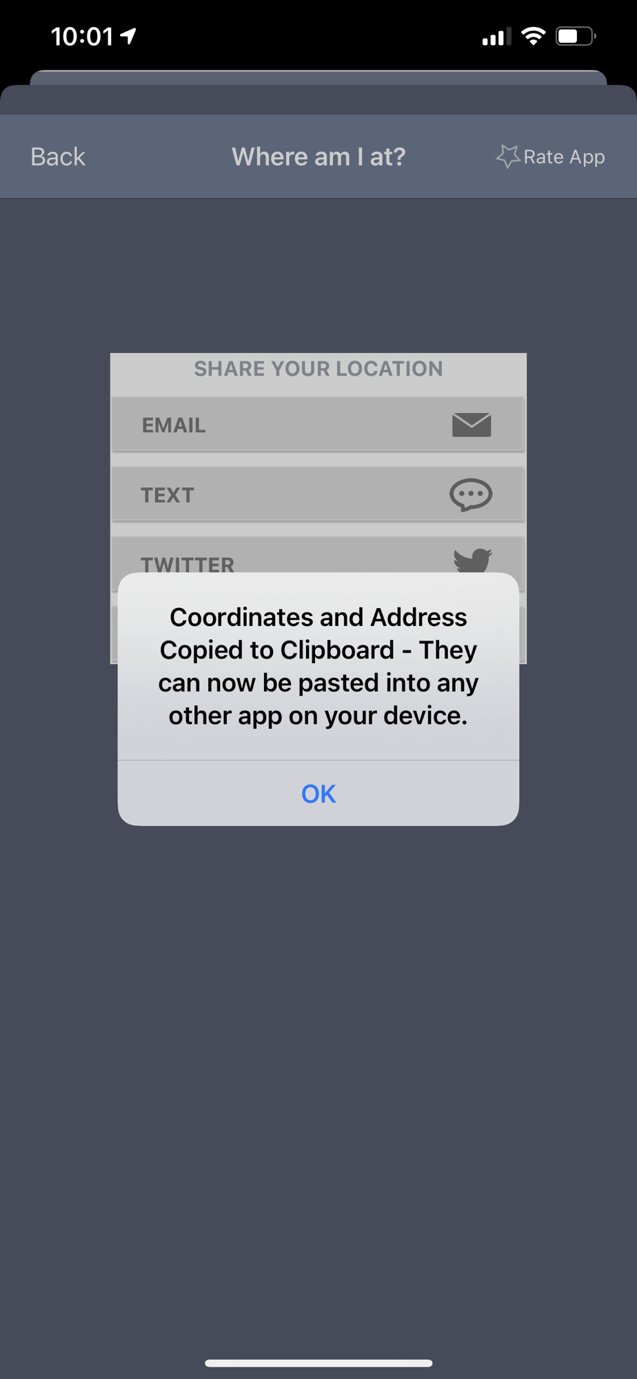 - Share your location on Twitter, by email, or through text/iMessage without leaving the app.