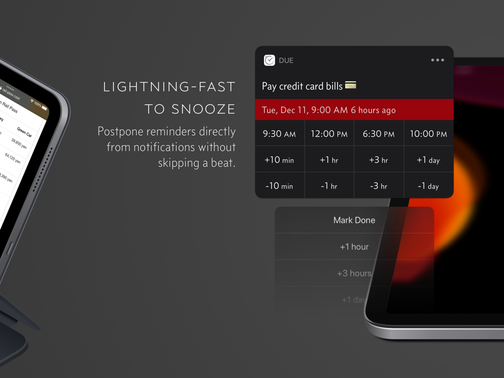 A time picker with 12 preset and fully customizable times lets you set due dates and postpone reminders in record time.