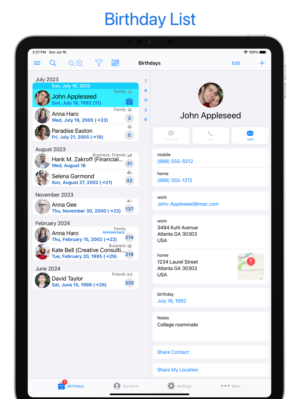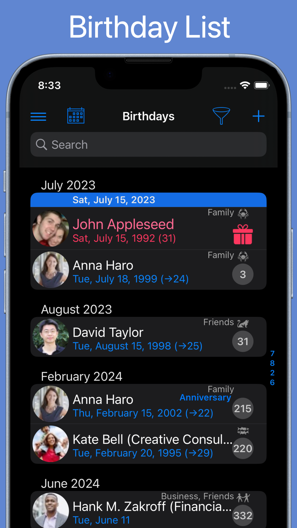 Stay effortlessly organized and ahead of the game with the most user-friendly birthday app out there! Seamlessly sort your birthday list by date or efficiently arrange your contact list by name, ensuring a streamlined view of all your essential information. And with the convenient calendar view, you'll have a bird's eye vantage point to promptly glance at upcoming celebrations. Say goodbye to missed birthdays and hello to stress-free planning with our easy-to-use birthday app!