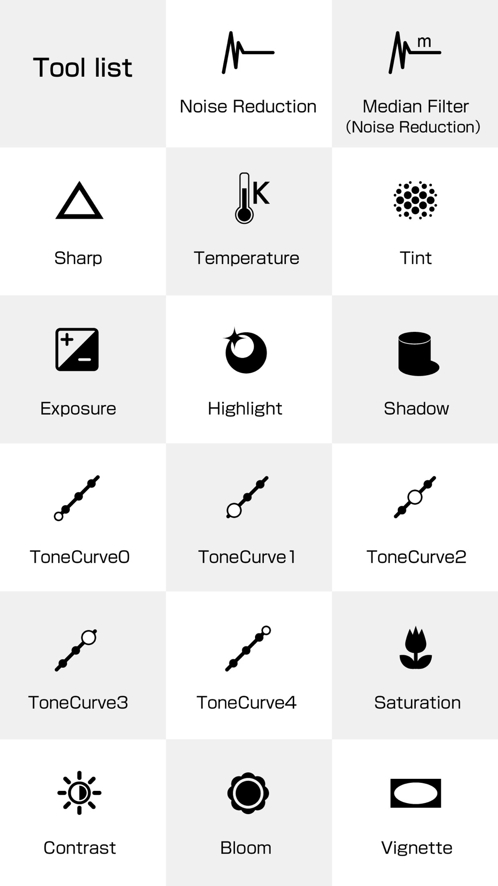Noise Reduction, Median Filter(Noise Reduction), Sharp, Temperature, Tint, Exposure, Highlight, Shadow, Tone Curve 0-4, Saturation, Contrast, Bloom(Soft), Vignette