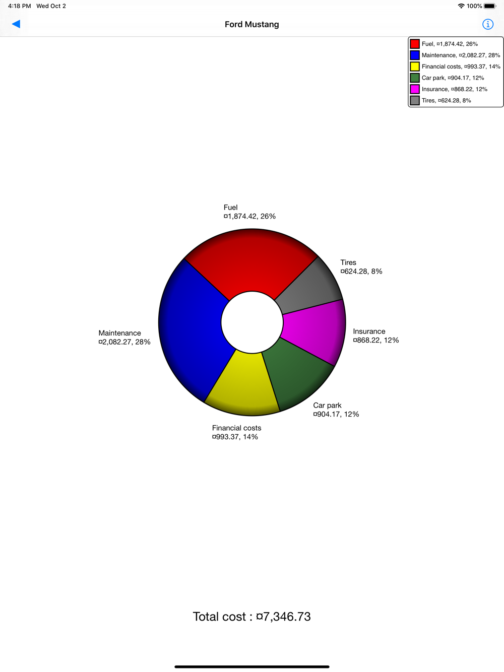 The application updates the overview and detailed statistics of your expenses: cost per spending category, cost per kilometer or daily cost. Non financial data, such as the change in mileage and average fuel consumption can also be calculated, and displayed in brief or in detail.