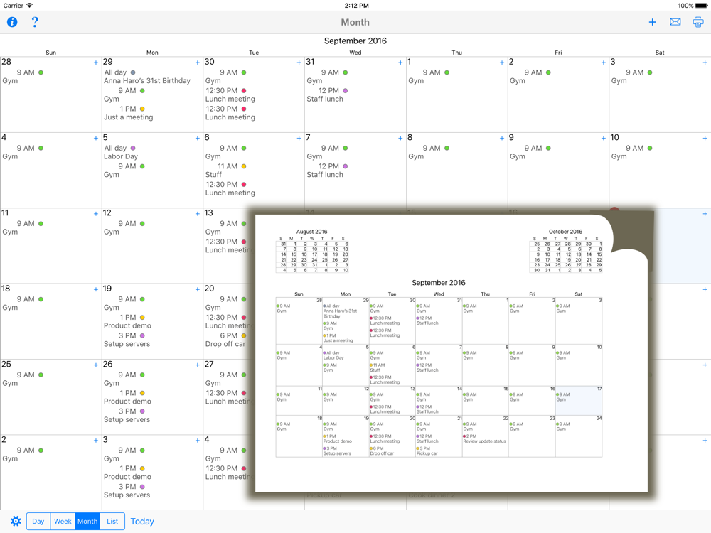 Print your Calendar and Reminders to any printer. You can print your Day, Week, Month and custom list calendar views to ANY printer, not just AirPrint. Email your calendar or reminders as a PDF file to share with others. Print out your monthly calendar and stick it to the fridge or office wall. Print out a shared family reminder shopping list.