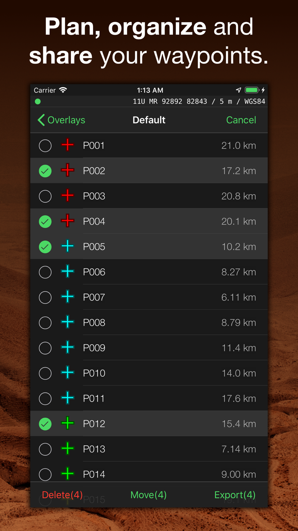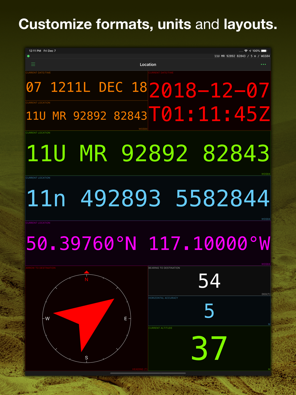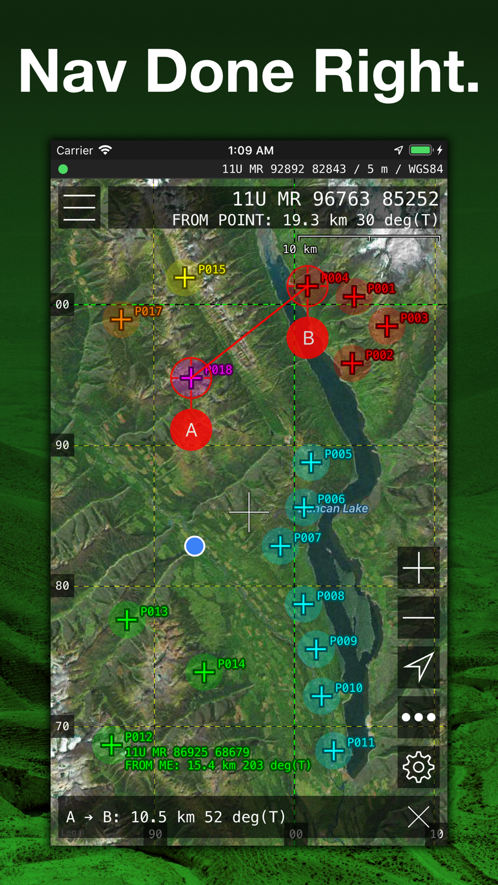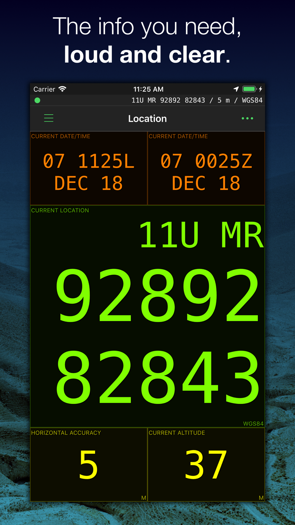 - View current location and waypoints on map, complete with custom smooth scrolling grid overlay (MGRS/USNG/OSNG/UTM)