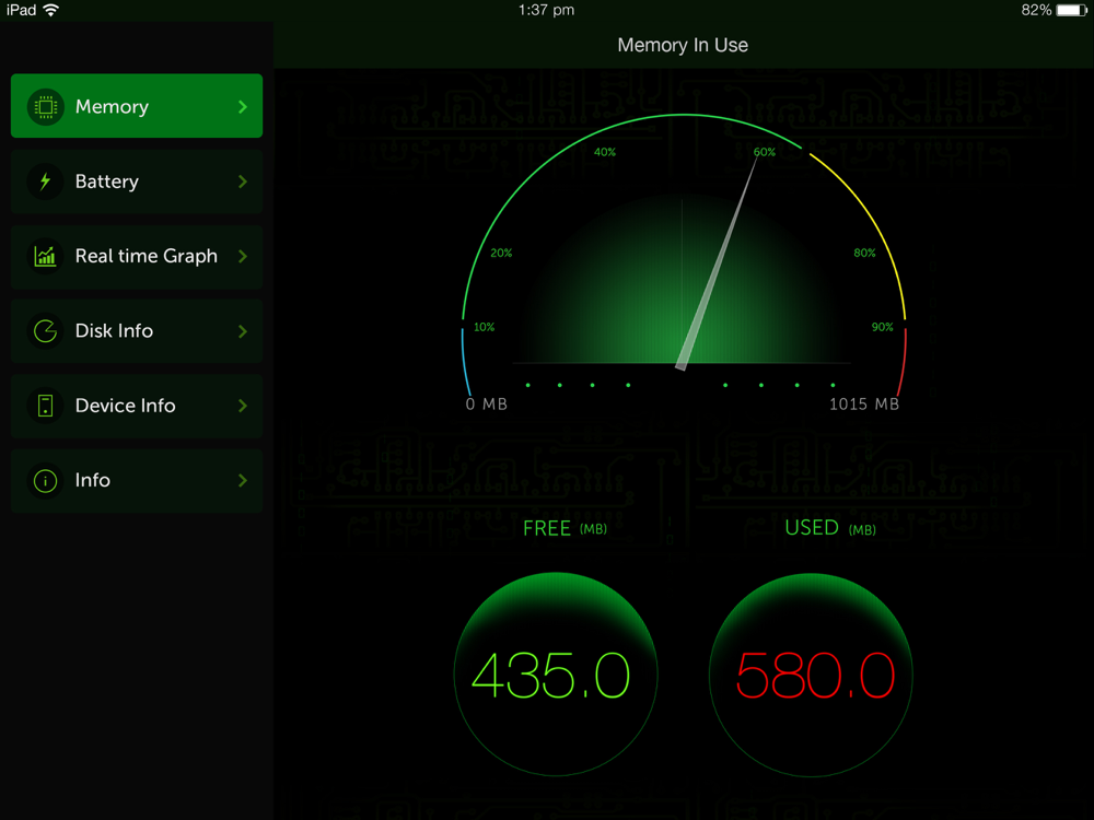 Shows the used and free iPhone memory available as used by other apps. This is shown in an excellent speedometer animation view. Double tap home button, and see other apps in use. Close out the other apps, and see the memory being reclaimed in this app, when the speedometer shows the free memory available increase.