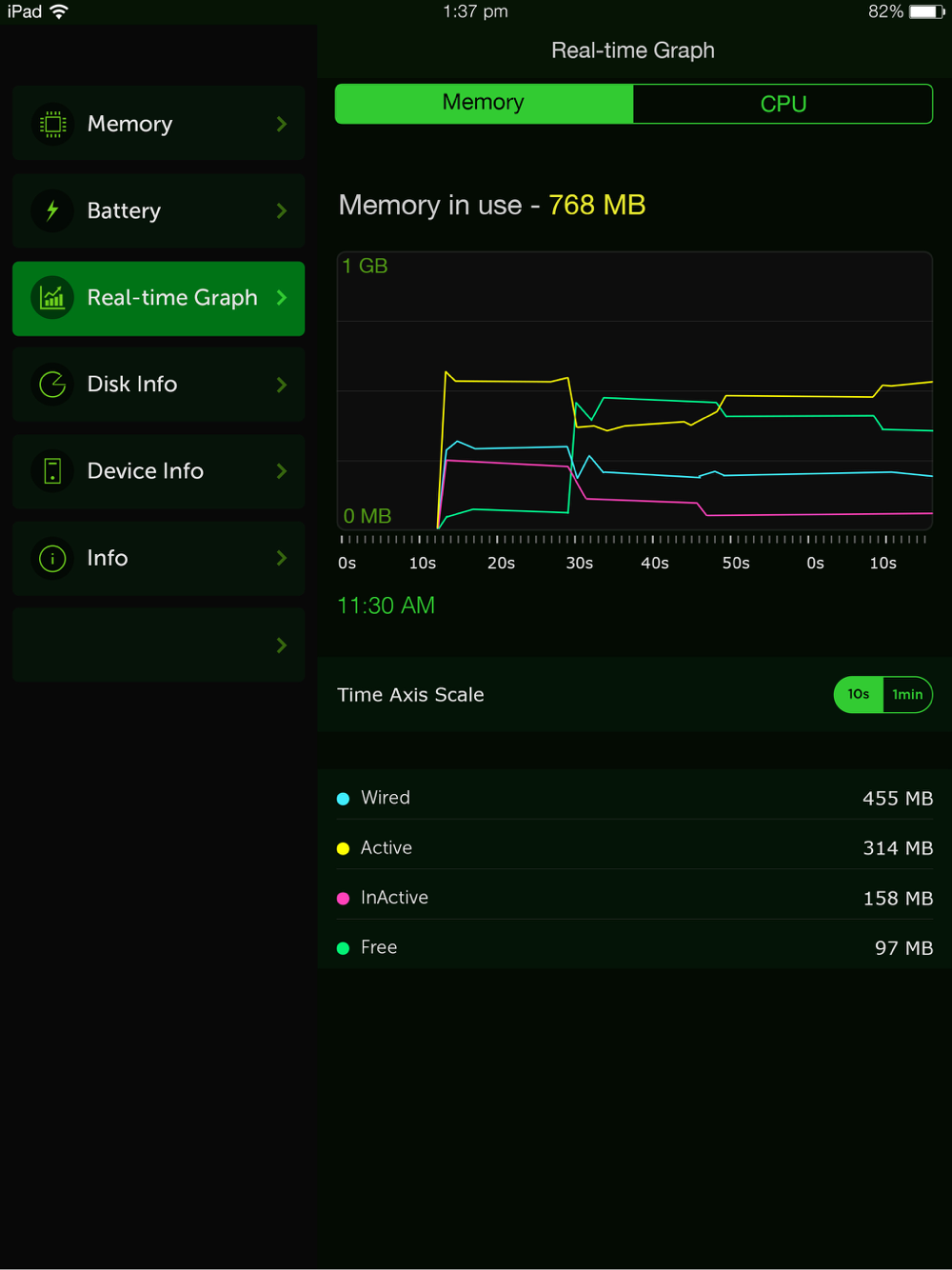 Double tap the speedometer, to see a 3D bar view of the different break up of the memory used. Like, Free, Wired, Active and Inactive memory of your iOS device.