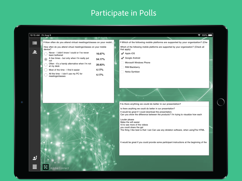 This Adobe Connect application brings all critical meeting capabilities from the desktop to your mobile device, enabling you to attend or even host meetings directly from your iPhone or iPad.