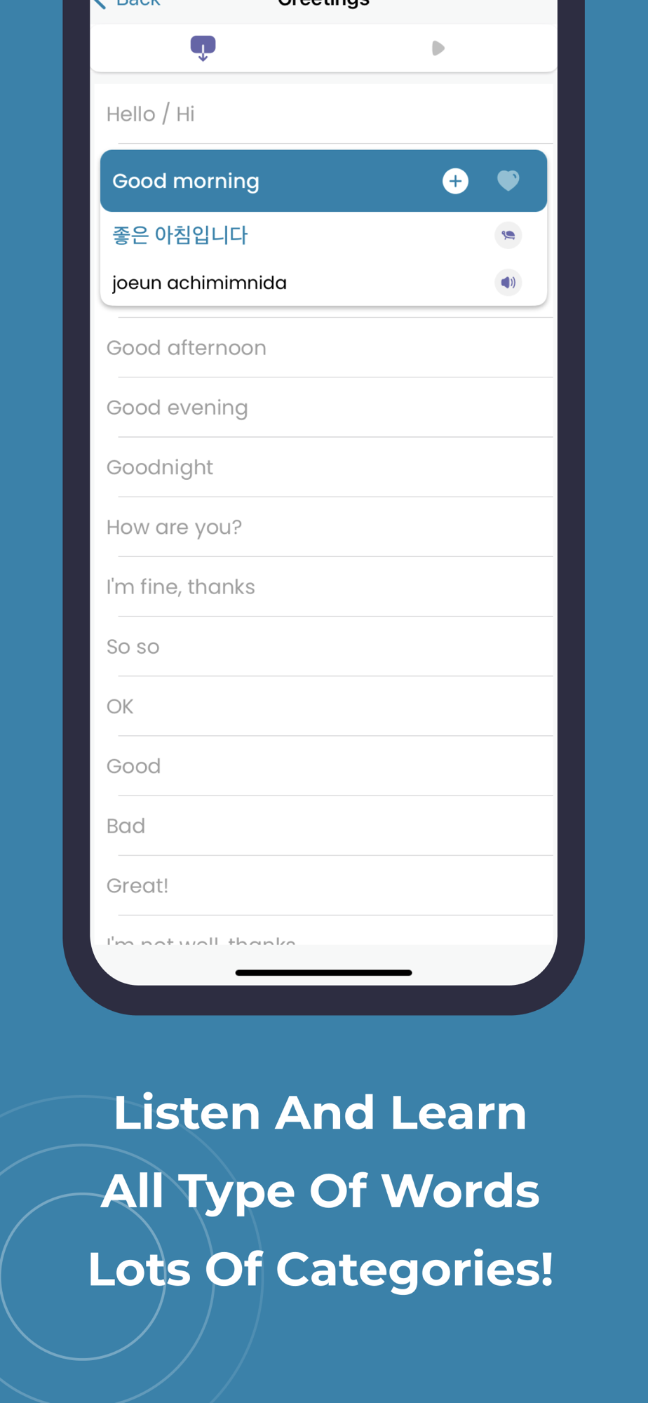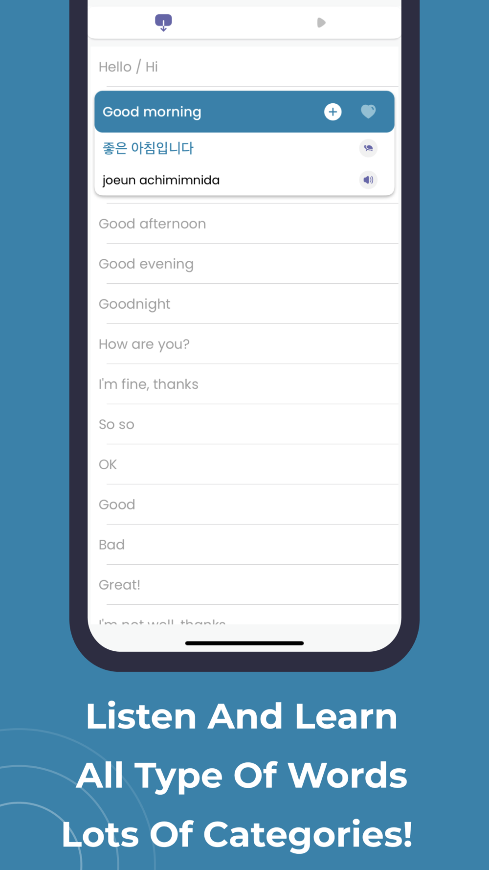 Whether you're planning a trip to Korea or just want to learn the basics of the language, Learn Korean - Phrasebook has everything you need to get started. It also works without an internet connection! See the most popular Korean phrases for any scenario. Listen to audio recordings and learn pronunciation from native speakers. Save your favorite phrases to easily access them whenever you need. Learning the Korean vocabulary can be overwhelming for beginners, use our app to simplify the process!