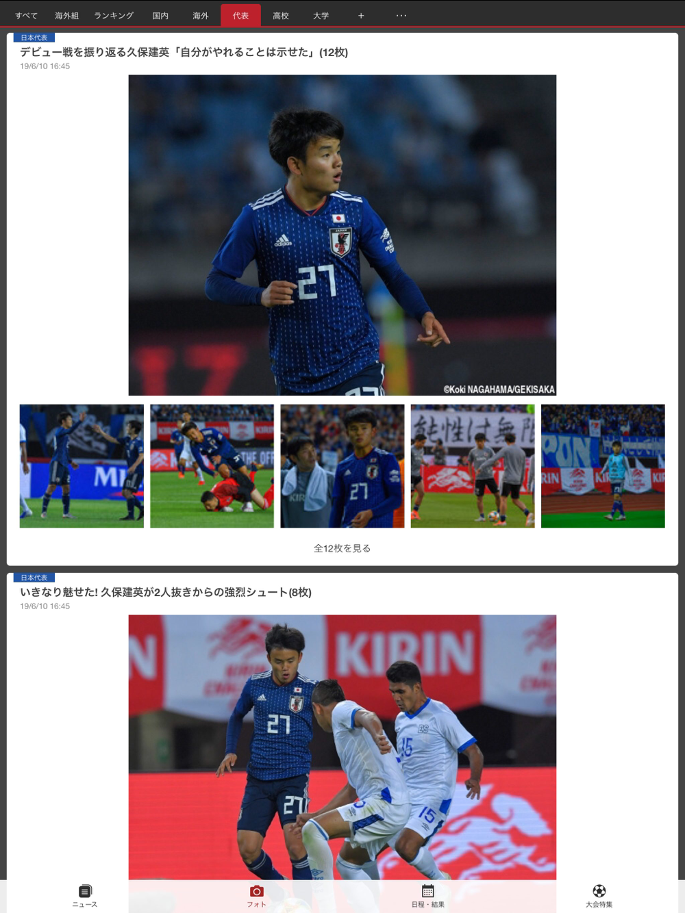 ●毎日50本前後のサッカーニュースをどこよりも早く報道。「すべて」「代表」「国内」「海外」「高校」「大学」のタブごとに好きなジャンルのニュースや写真、データを素早く手軽に閲覧できます。