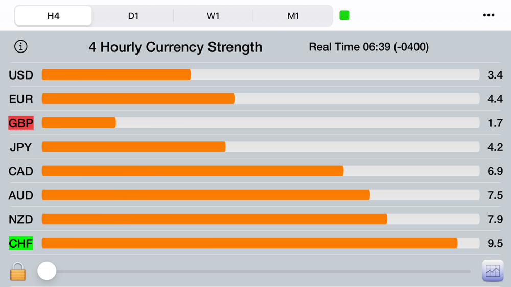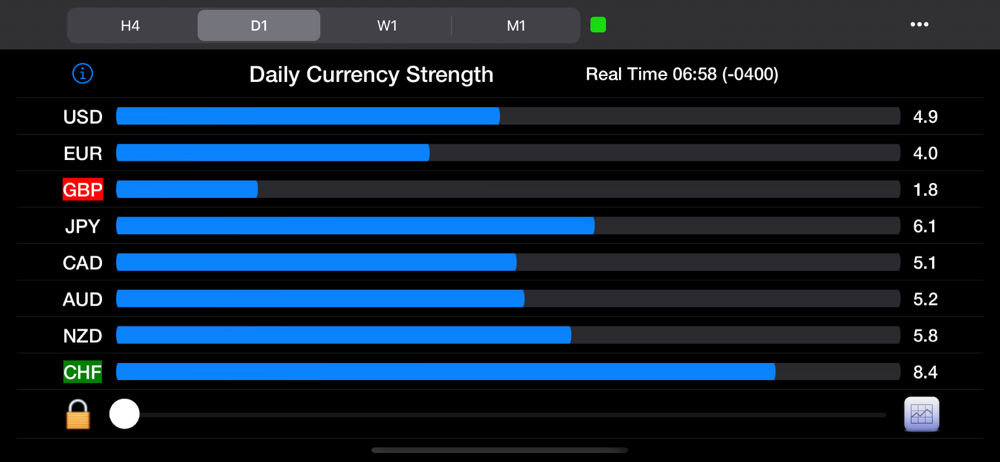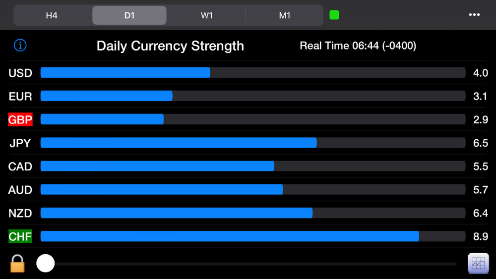 Currency strength is a popular indicator used by Forex traders to make sense of price moves in the Forex market. It takes advantage of price correlation between various Forex pairs. Currency strength is measured for 8 currencies (USD, JPY, EUR, GBP, AUD, NZD, CHF & CAD) and is reported on a scale of 0 (weakest) to 10 (strongest).