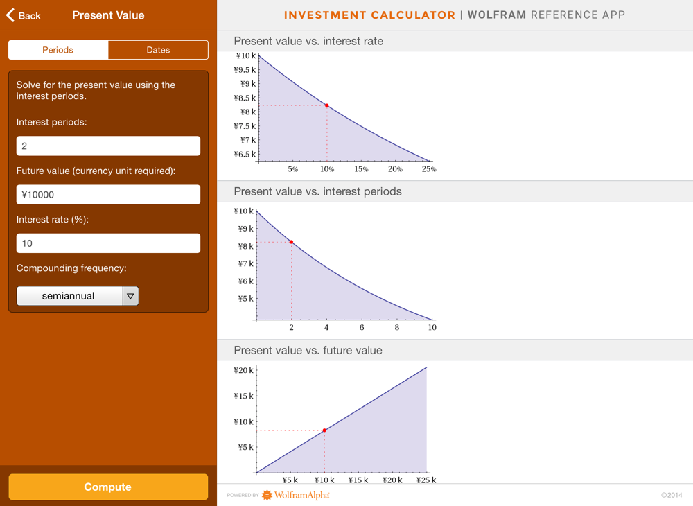 The Wolfram Investment Calculator Reference App draws on the computational power of Wolfram|Alpha's supercomputers over a 3G, 4G, or Wi-Fi connection.