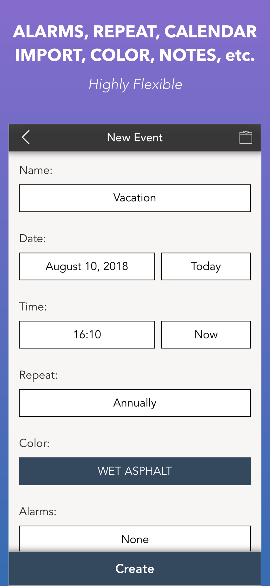 Countdown to Big Events was designed with simplicity and functionality. Stunning graphics make tracking time easy and awesome. Personalize each event, using multiple theme colors, alarms, notes, repetitions and other customizations.
