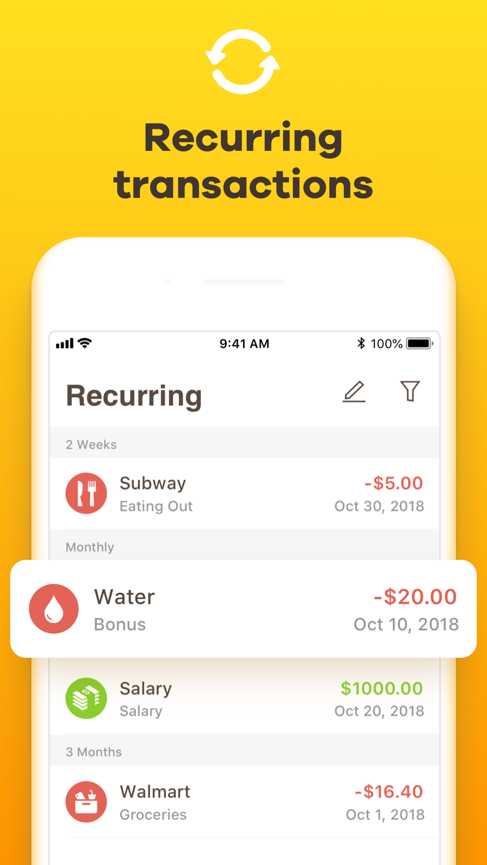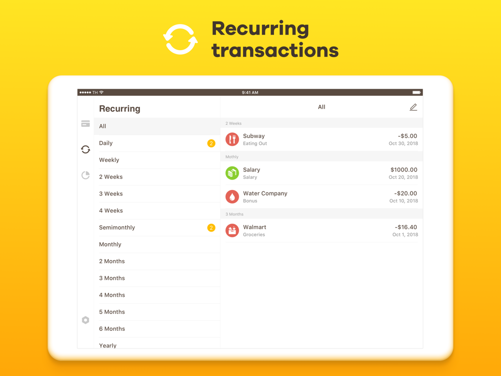 -Save a transaction to be used repeatedly(daily, weekly, 2 weeks, monthly, tire monthly), without retyping all the details.