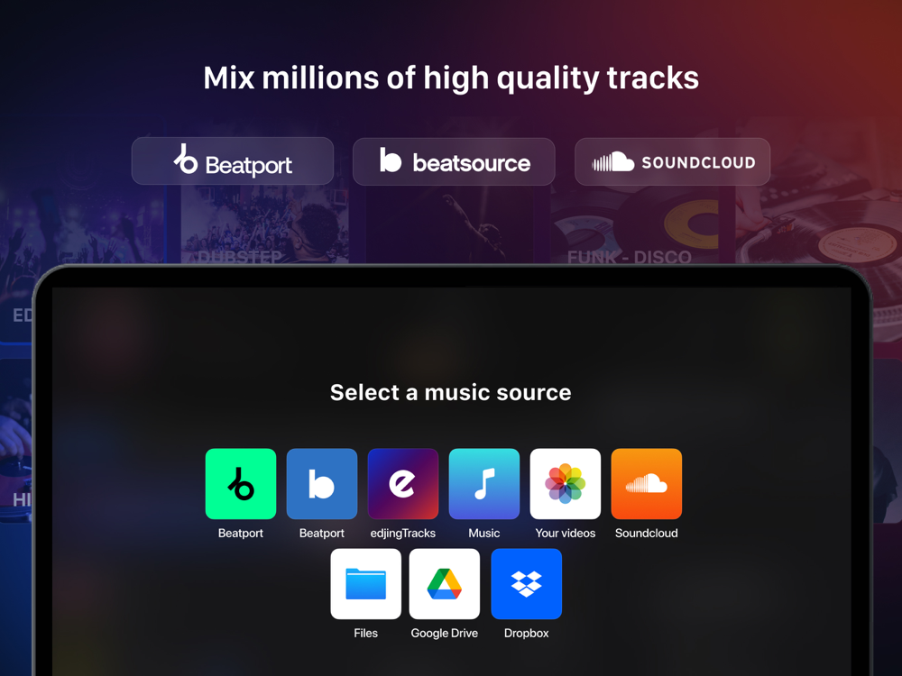 Access millions of tracks coming from Beatport, SoundCloud Go +, iTunes and your Cloud sources, and remix in an instant with more than 20 DJ fx and features. Not to mention the sampler and the hardware integration to go even further.