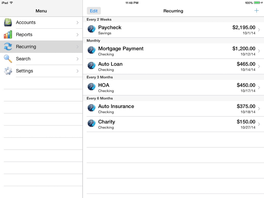 Schedule transactions to repeat weekly, biweekly, monthly, semimonthly, quarterly, biannually, or yearly on a start date that you choose.