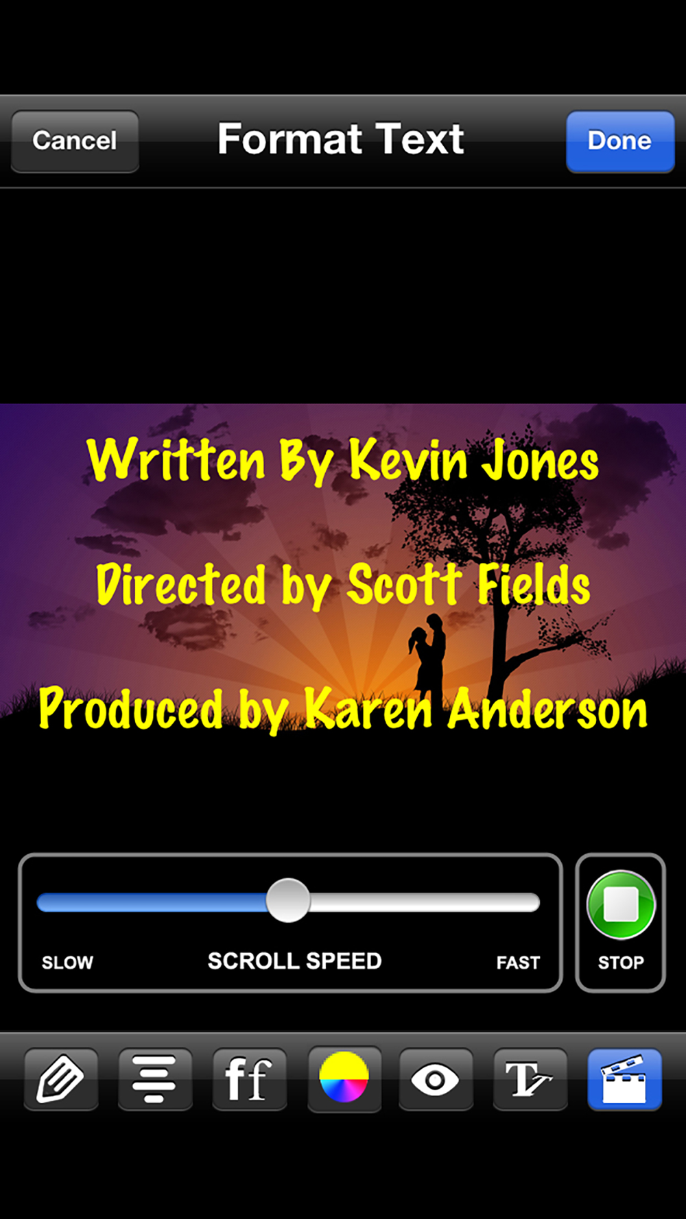 5. Tap on the Animation button (movie slate icon along bottom, right side). Select Scrolling Text. Use the slide bar to adjust the scrolling speed. When finished, tap Done and Create as Video.