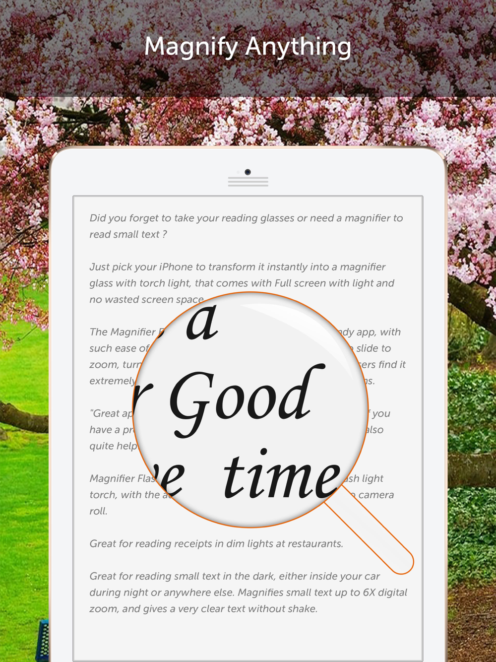Just pick your iPhone to transform it instantly into a magnifying glass with flash light, that comes in Full screen with light and NO wasted screen space.