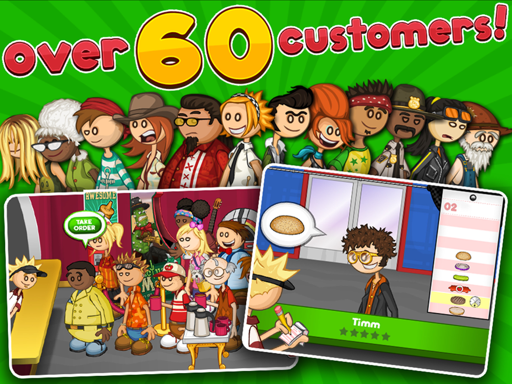 Grab your spatula and get ready for the biggest burger-flipping adventure on the iPad! In this brand-new edition of Papa's Burgeria, you are unwillingly left in charge of Papa Louie's famous Burgeria. You'll need to take orders, grill patties, add toppings, and serve the burgers to all of your wacky customers.