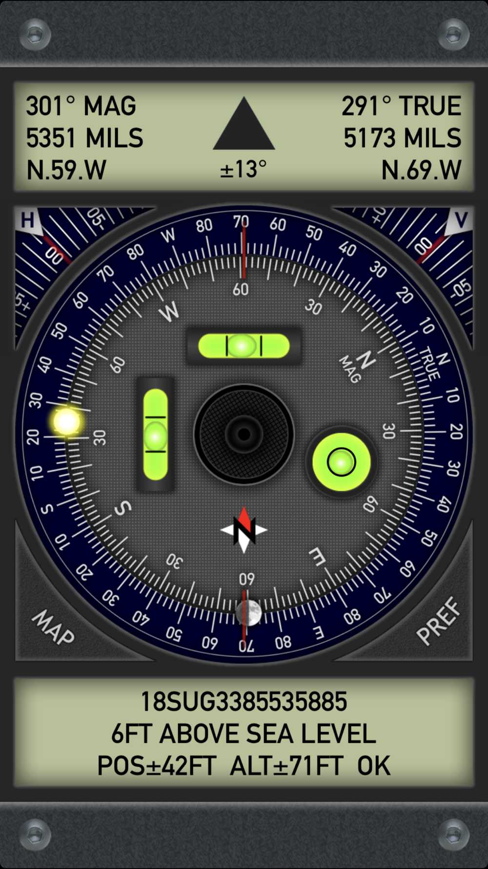 Pro Compass displays location and altitude, with decimal, degree-minute-second, UTM, and MGRS position formats. An optional "Datum Pack" adds over 230 geodetic datums covering regions and countries on all continents around the world. The app also contains a built in two-axis inclinometer that drives two independent bubble levels and a bullseye level. The inclinometer has angle readout dials for each axis, making it useful for many different types of measurements including slopes, pitches, sight lines, and geological angles like dip and strike.