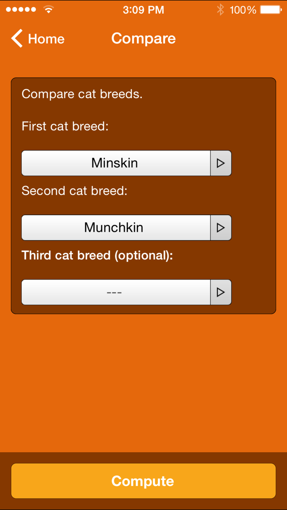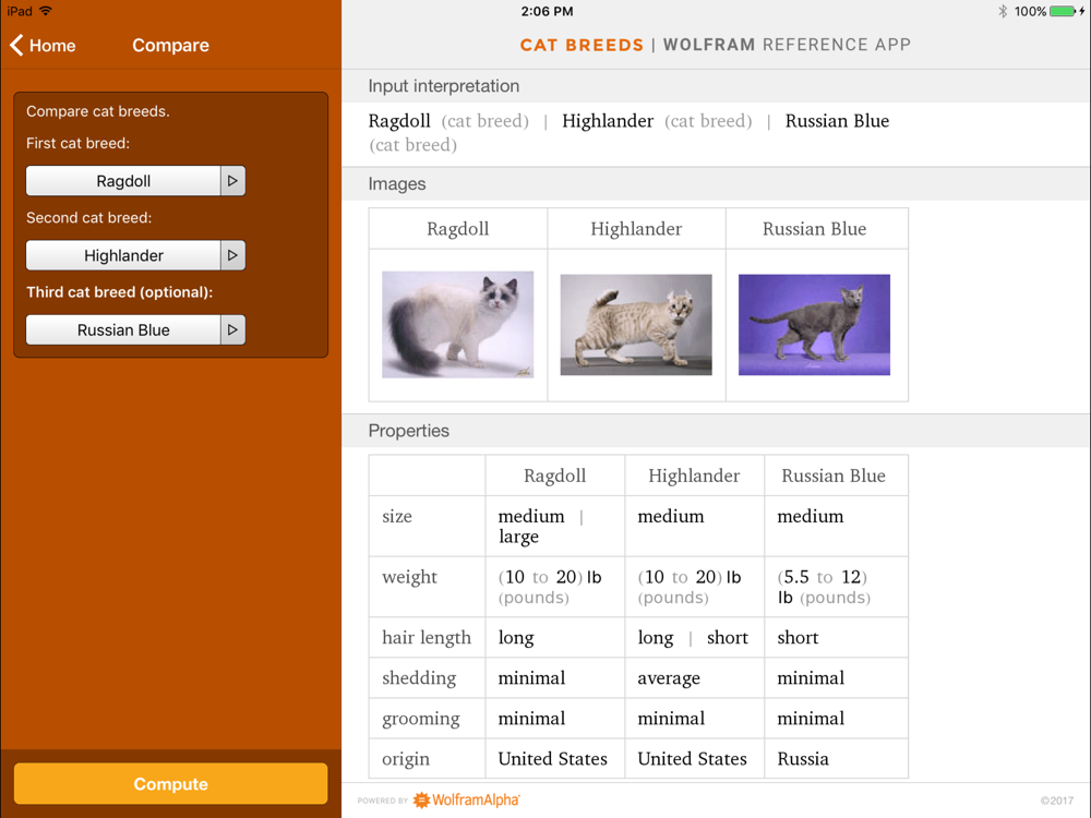 Learn facts about more than 70 cat breeds. The Wolfram Cat Breeds Reference App will help you discover which breed might be the perfect fit for you by computing information about weight, grooming, temperament, and more. From the Bengal and Savannah to the Persian and the Ragdoll, the searchable list of cat breeds will provide you with hours of interesting facts and images.