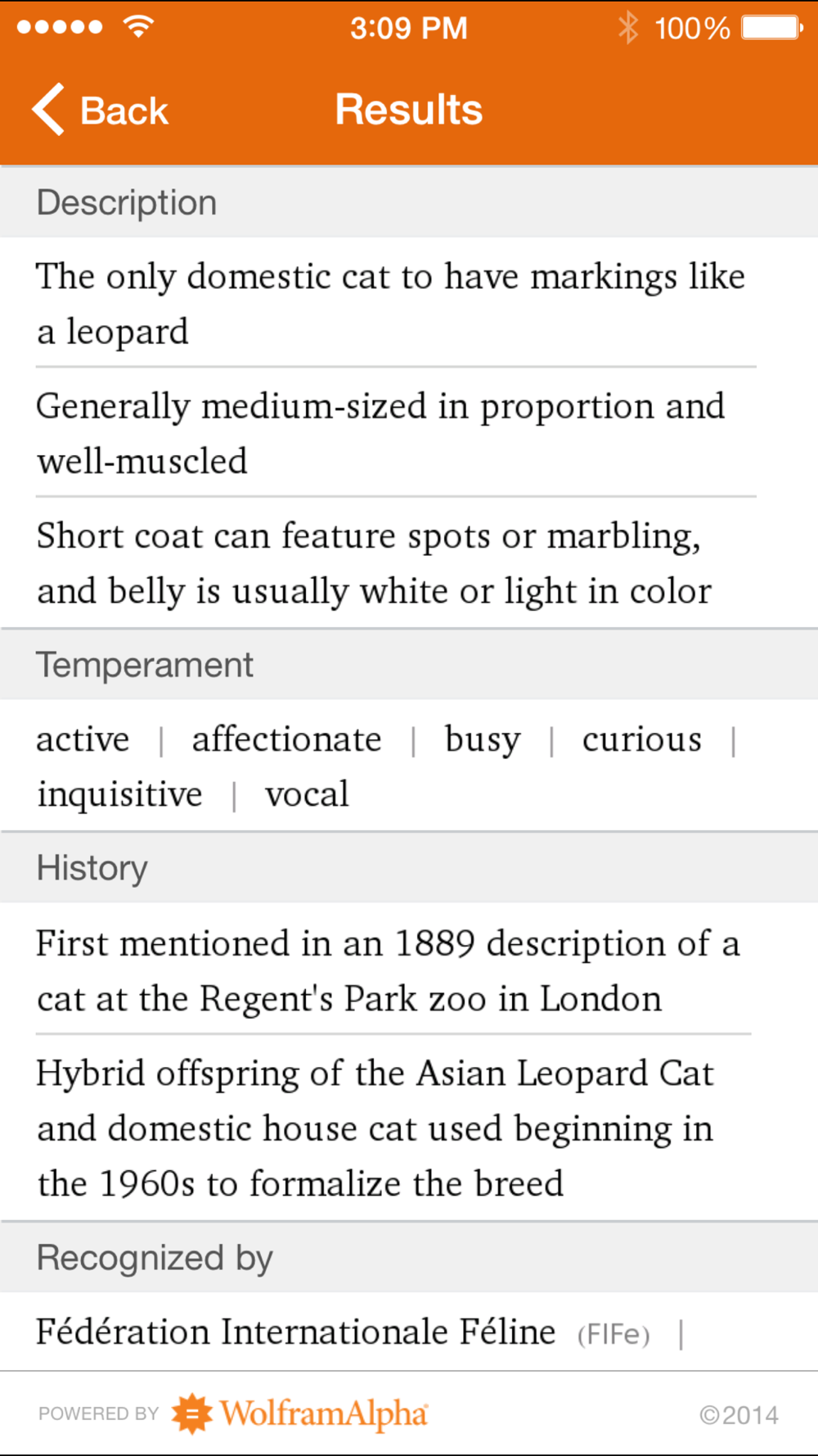 The Wolfram Cat Breeds Reference App draws on the computational power of Wolfram|Alpha's supercomputers over a 3G, 4G, or Wi-Fi connection.